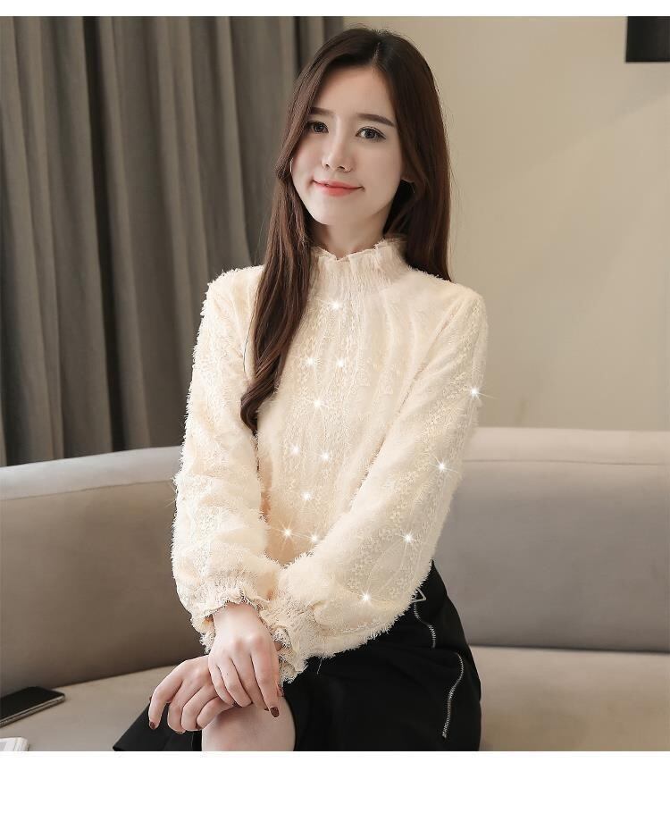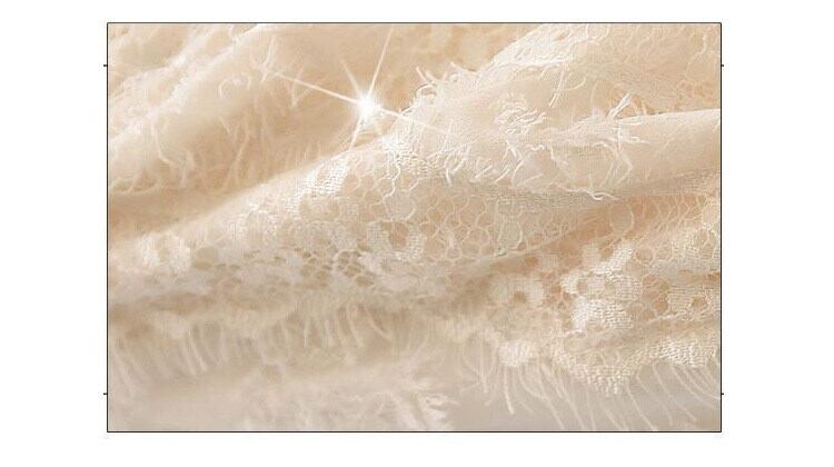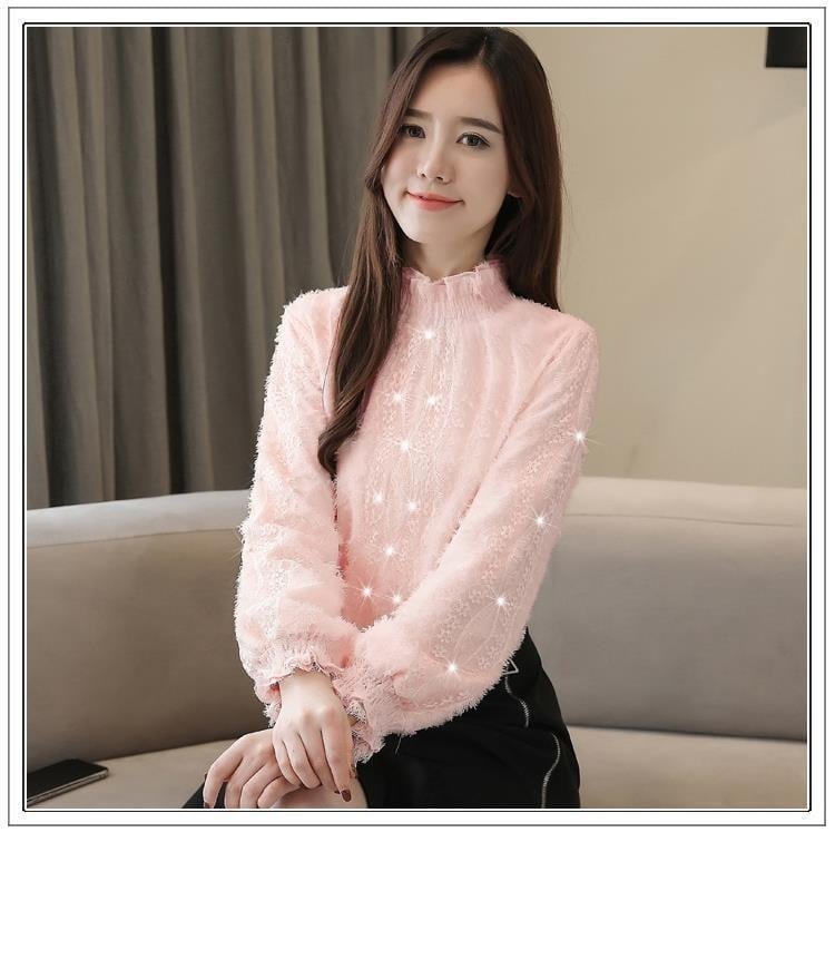 ハイネックと繊細なレースフリルが、首元から優美な雰囲気を演出します。