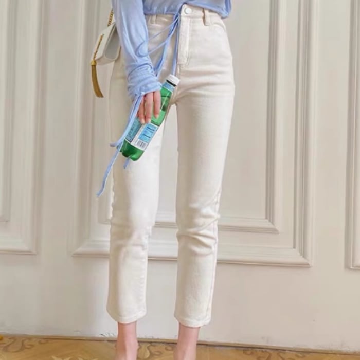ハイウエストなクロップド丈のデニムパンツ