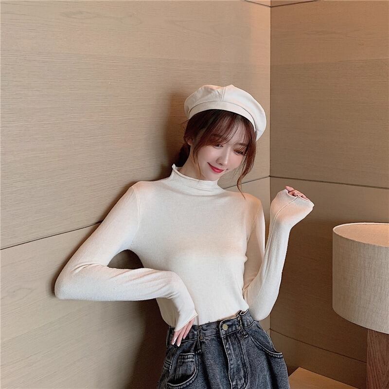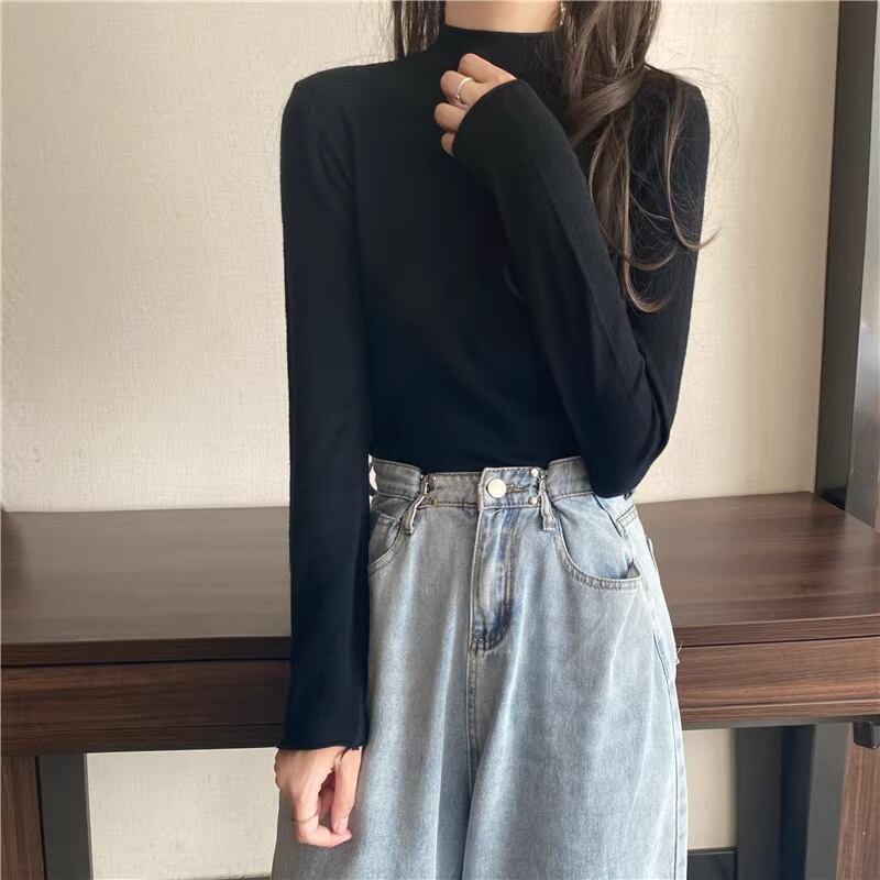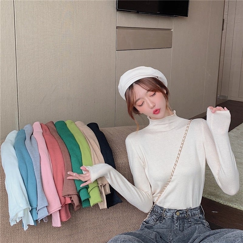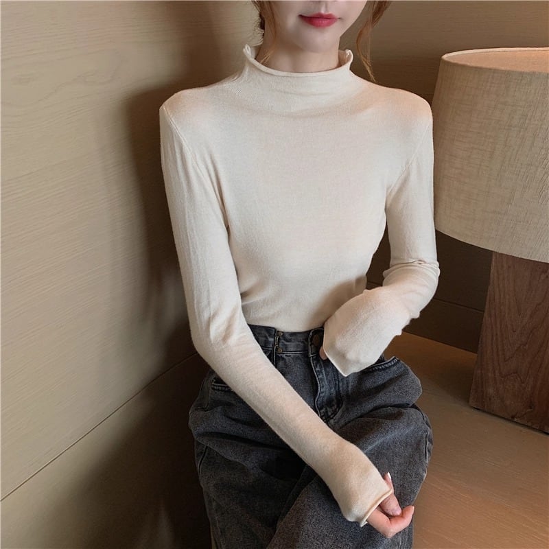 ハイネックデザインが首元をすっきりと見せ、細身のシルエットで女性らしさを引き立てます。