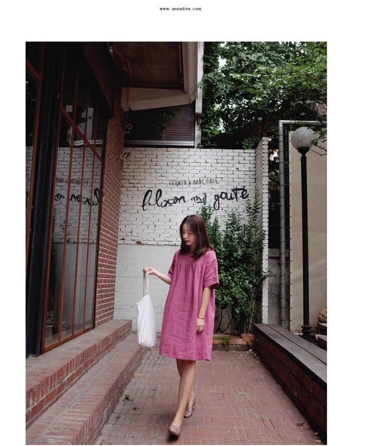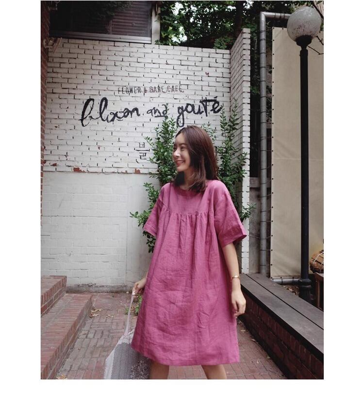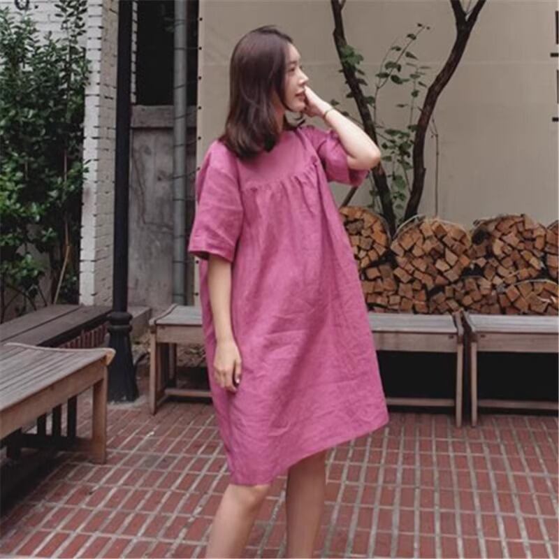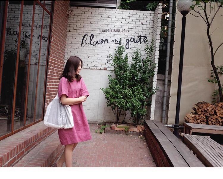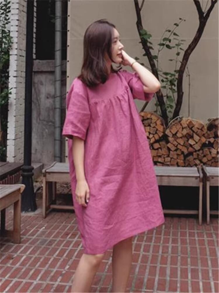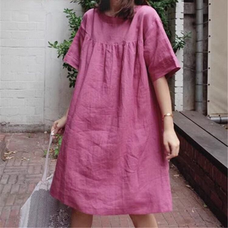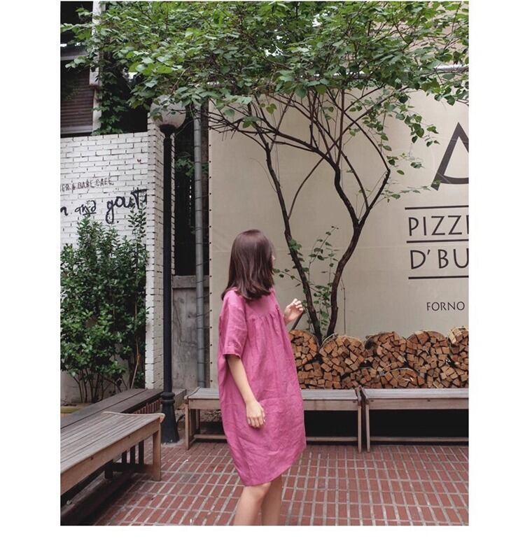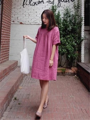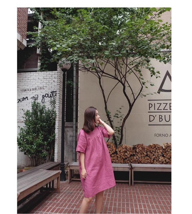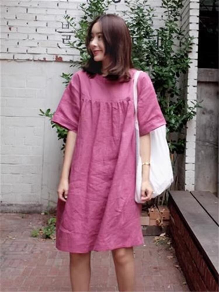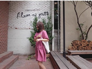 ふんわり広がるAラインシルエットが魅力の、ローズレッドの半袖ワンピース。