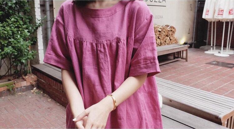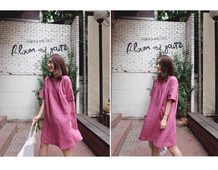ラウンドネックと切り替えギャザーデザインが顔まわりをすっきり見せ、ほどよいオーバーサイズ感が体型をさりげなくカバーします。