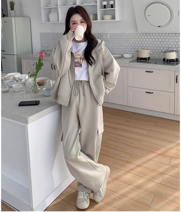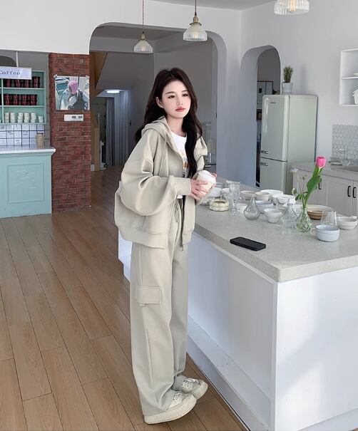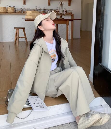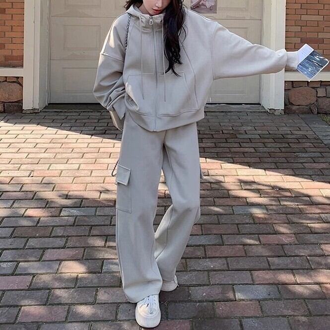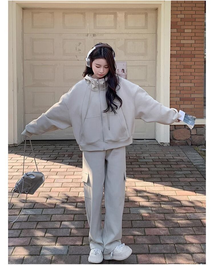 リラックス感とこなれ感を両立した、パンツ×パーカーのツーピースセット。オーバーサイズのシルエットとフード付きデザインが、程よい抜け感とトレンド感をプラスします。ファスナーとポケット付きで、機能性にも優れた一着です。