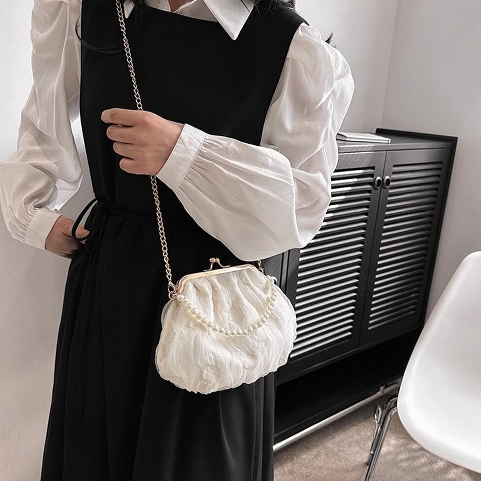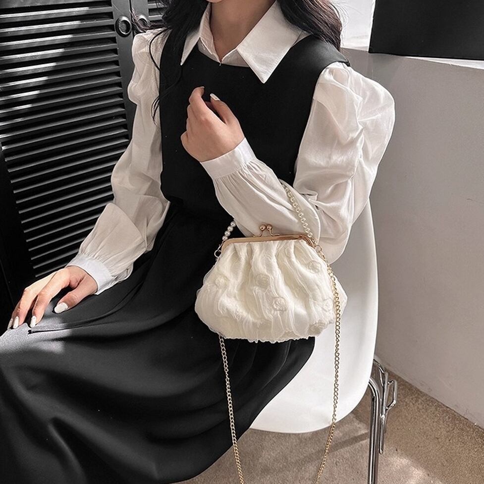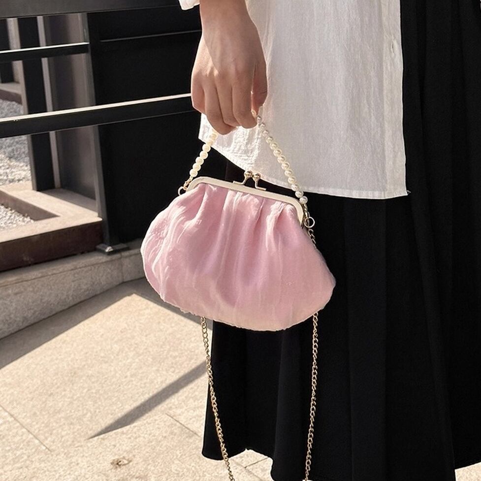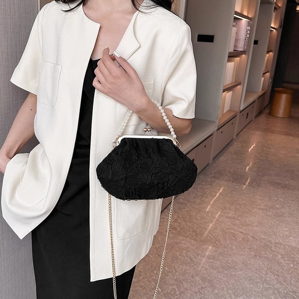 がま口スタイルでぷっくりした形がかわいいミニバッグ。高見えするおしゃれなポコポコ素材がポイント。持ち手のパールが女性らしさを演出してくれる。クラッチバッグ風にもお使い頂ける2wayです。きれいめにもカジュアルにも合わせやすくデイリー使いはもちろんパーティーシーンやフォーマルにも大活躍。
