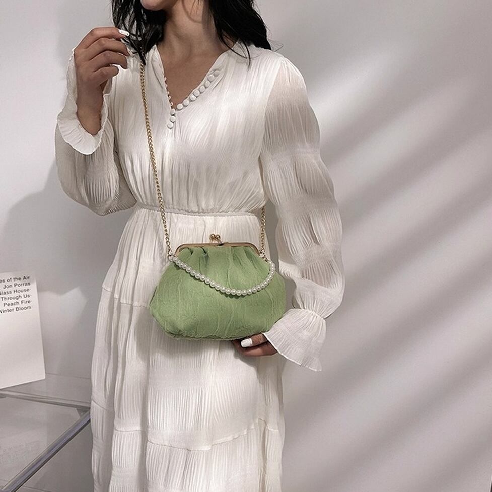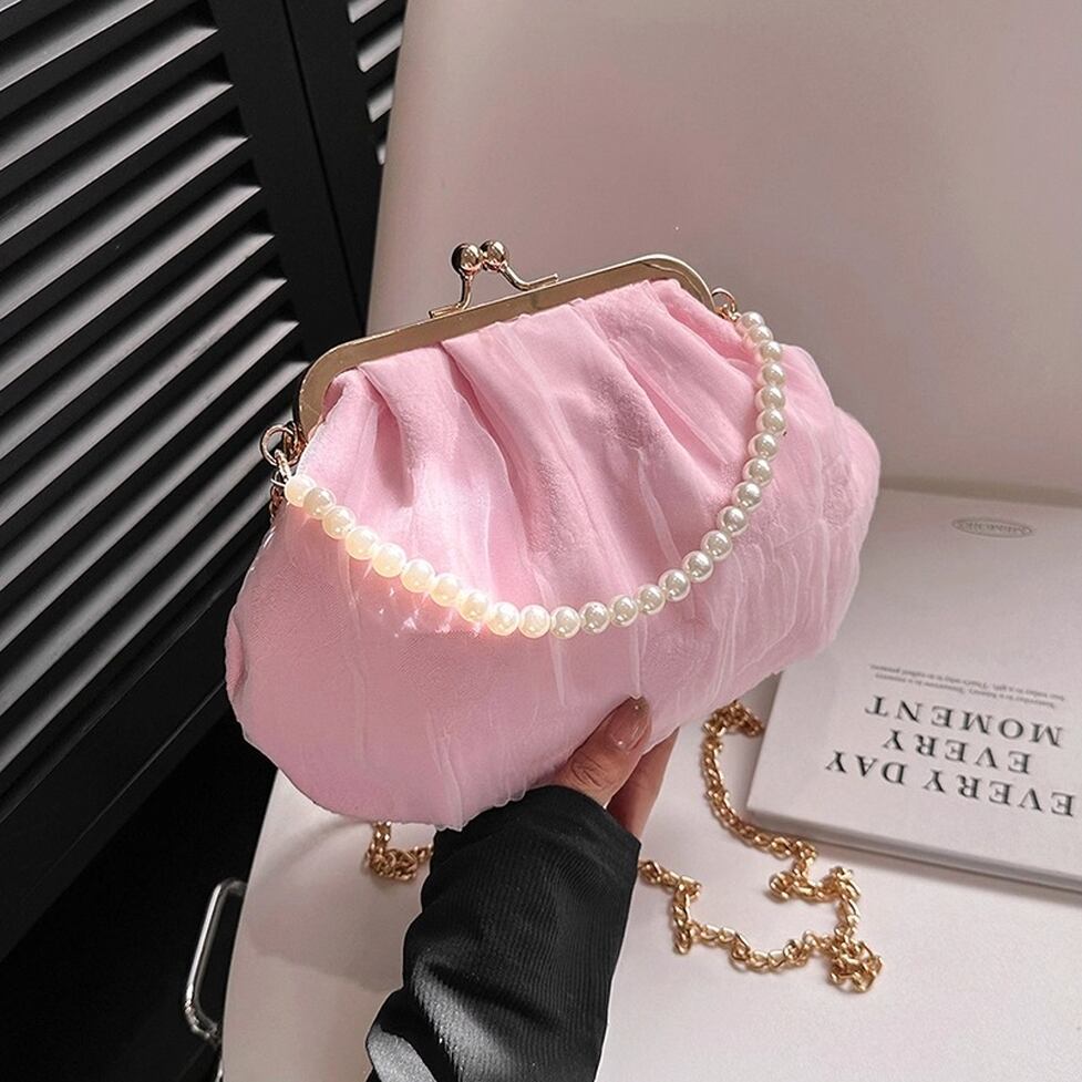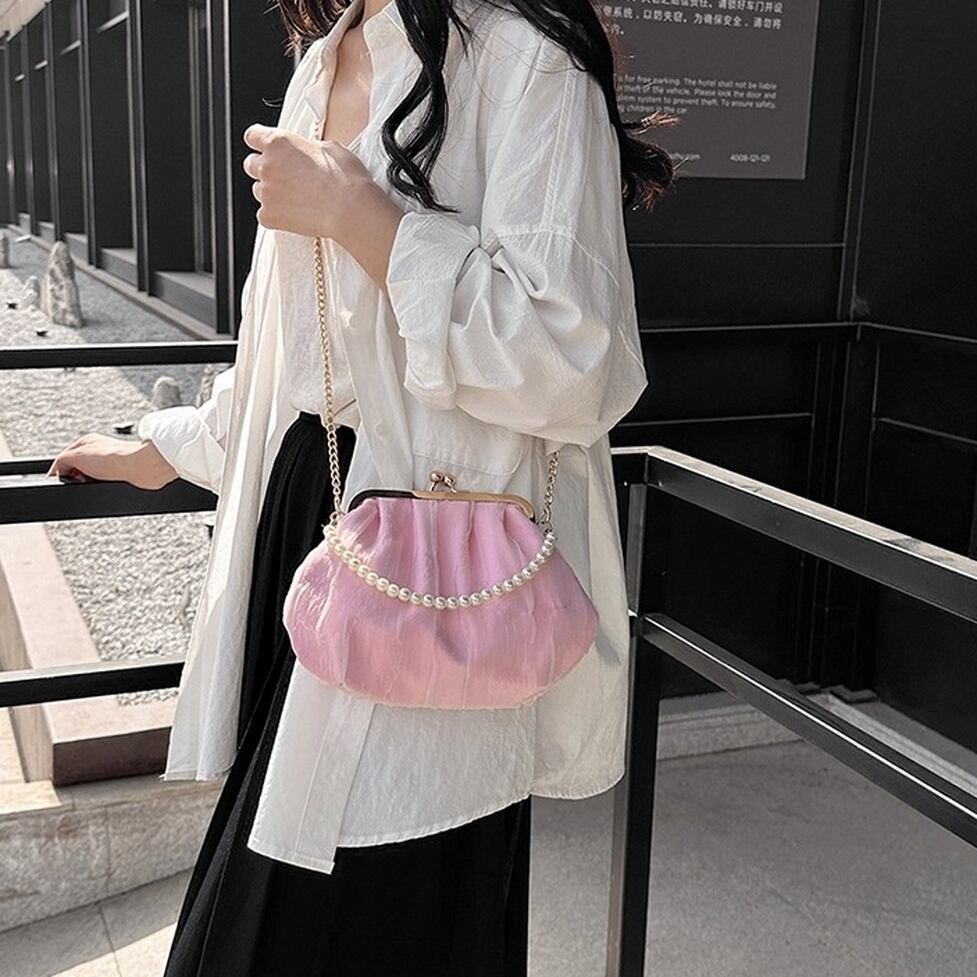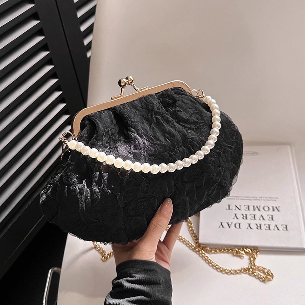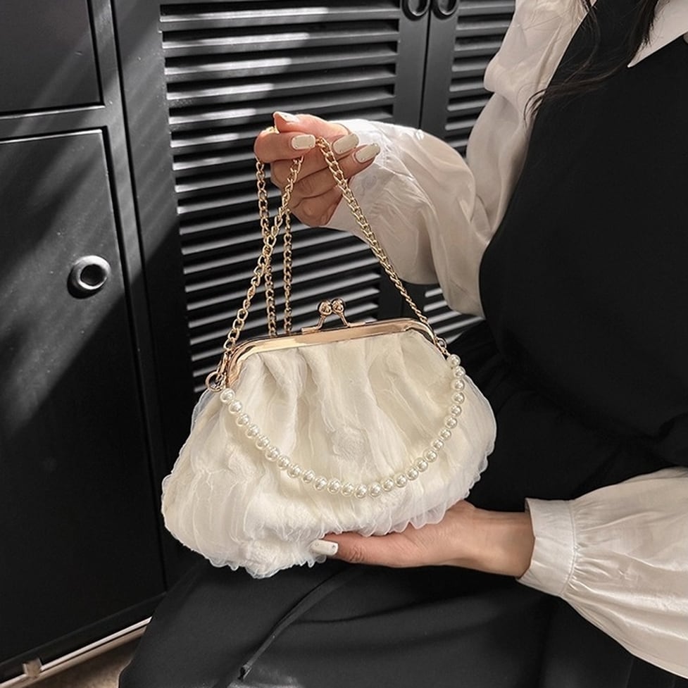 がま口スタイルでぷっくりした形がかわいいミニバッグ。高見えするおしゃれなポコポコ素材がポイント。持ち手のパールが女性らしさを演出してくれる。クラッチバッグ風にもお使い頂ける2wayです。きれいめにもカジュアルにも合わせやすくデイリー使いはもちろんパーティーシーンやフォーマルにも大活躍。