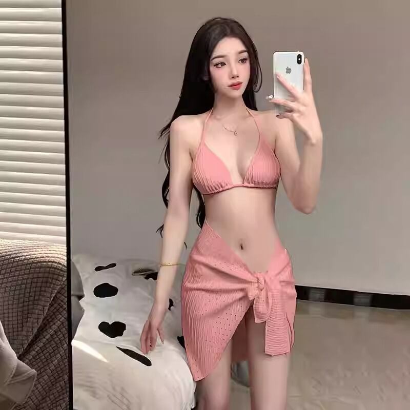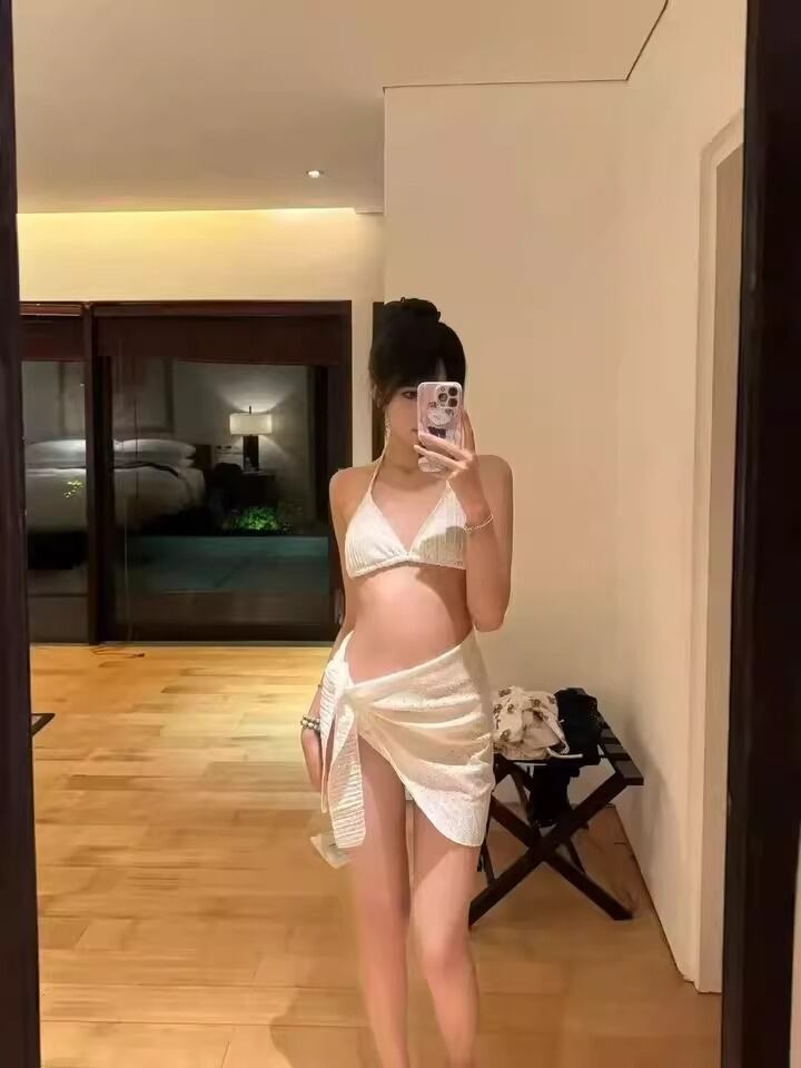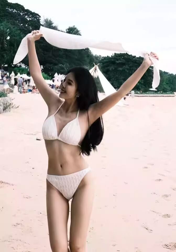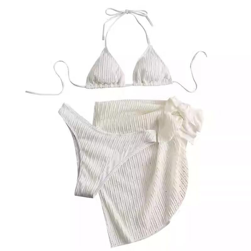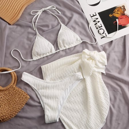 上品なムードを漂わせるホワイトの三角ビキニ。華奢なホルターネックデザインがデコルテを美しく引き立て、透明感のある大人可愛いスタイルを演出します。シアー感のある素材が涼しげで、リゾートやプール、ナイトスパなど夏の特別なシーンにもぴったり。