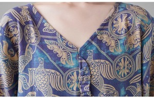 落ち着いたカラーに個性的でエスニック感のあるアート調プリントをあしらい、ナチュラルながらも存在感のある一枚に仕上げました。