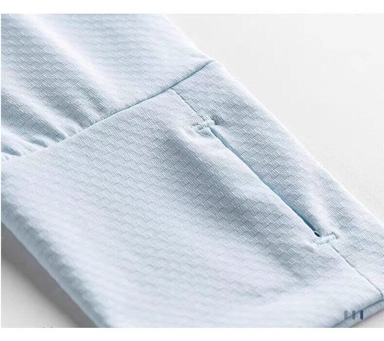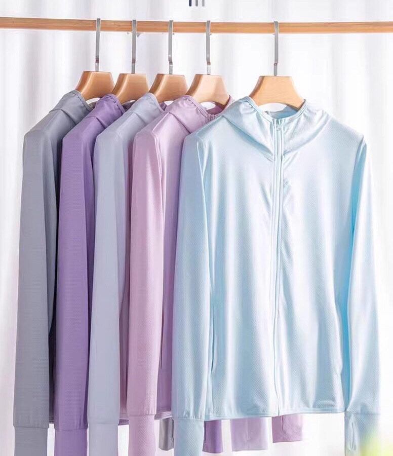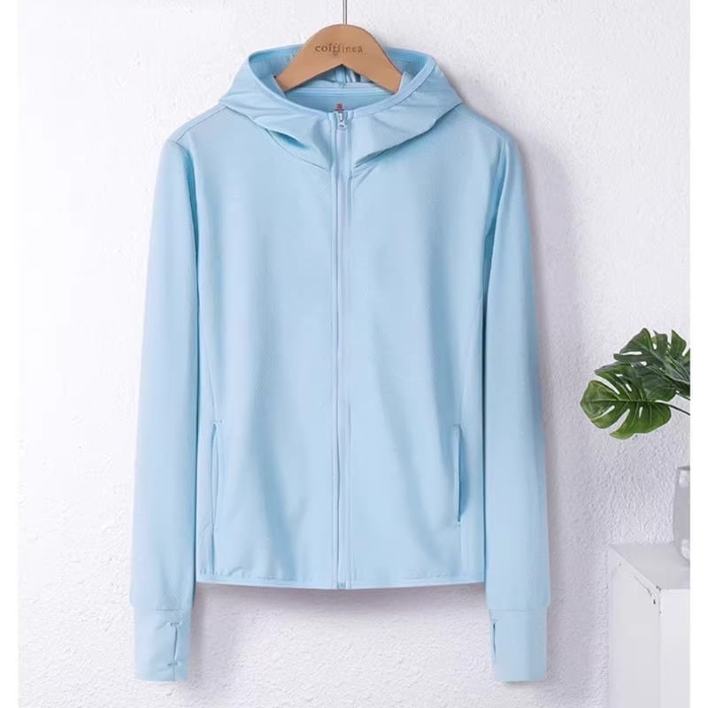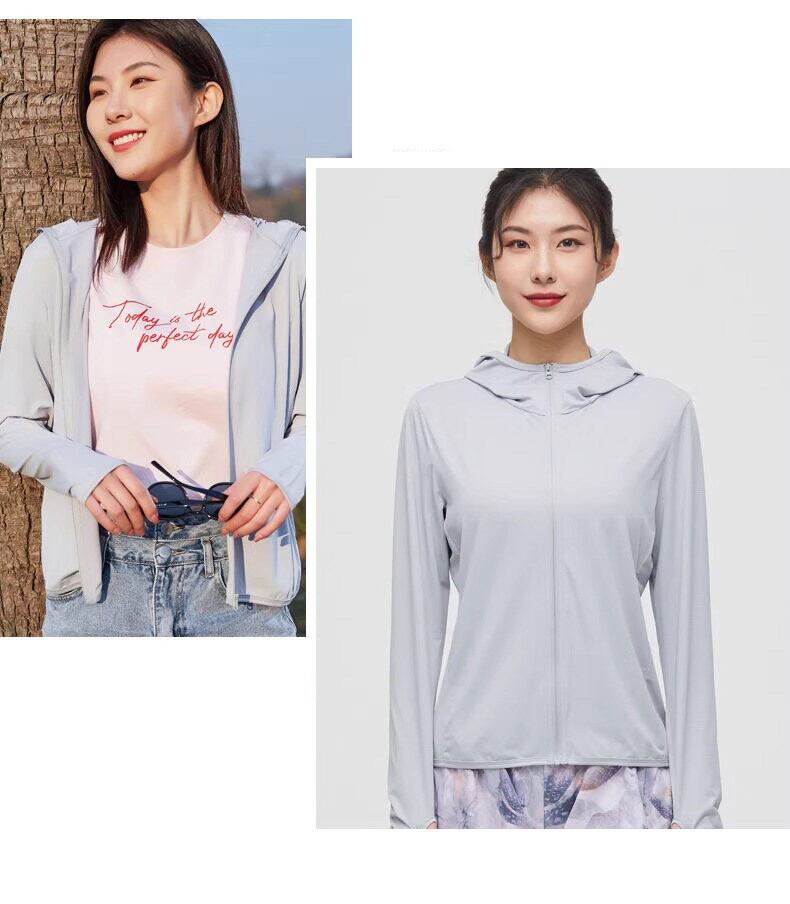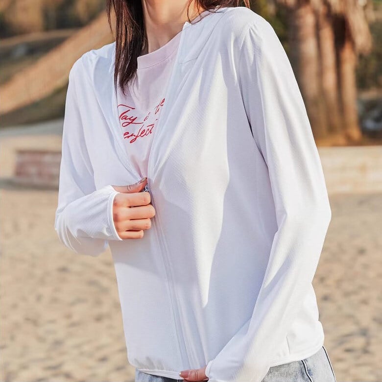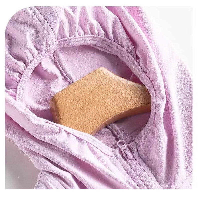 着脱しやすい前開きの指穴とフード付きデザインで、しっかり陽射し対策できます。