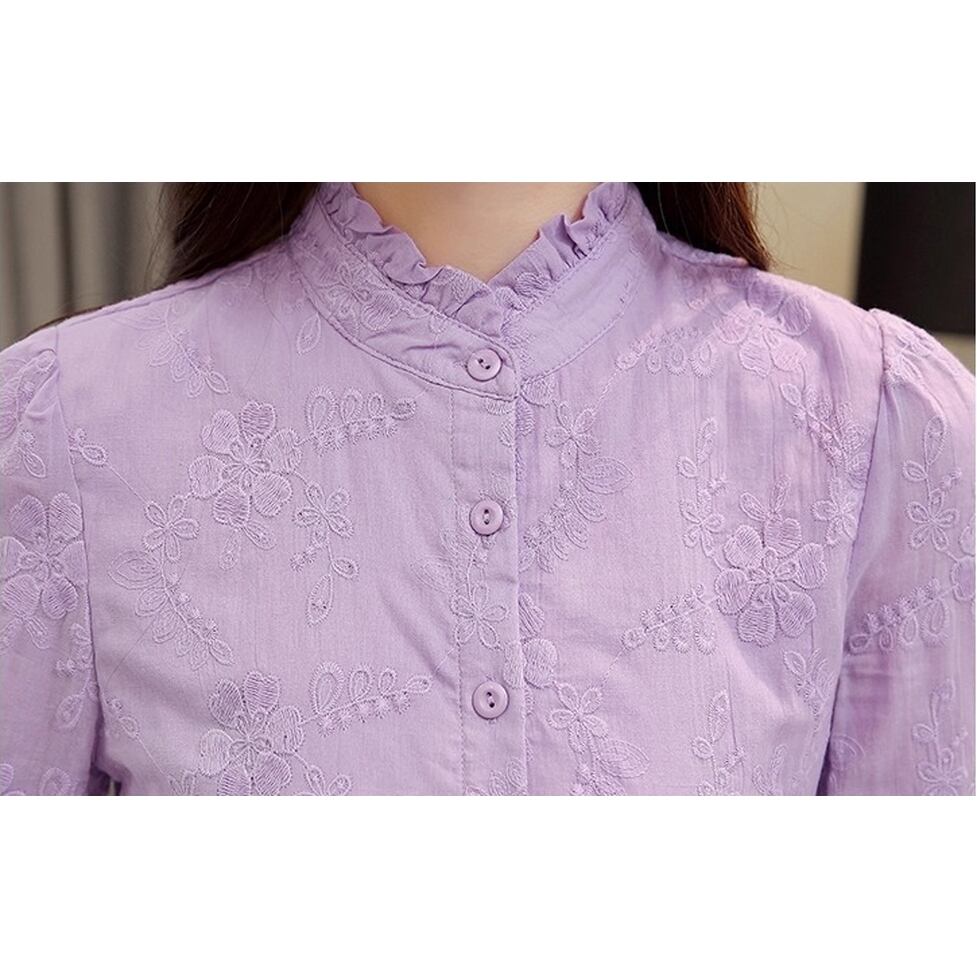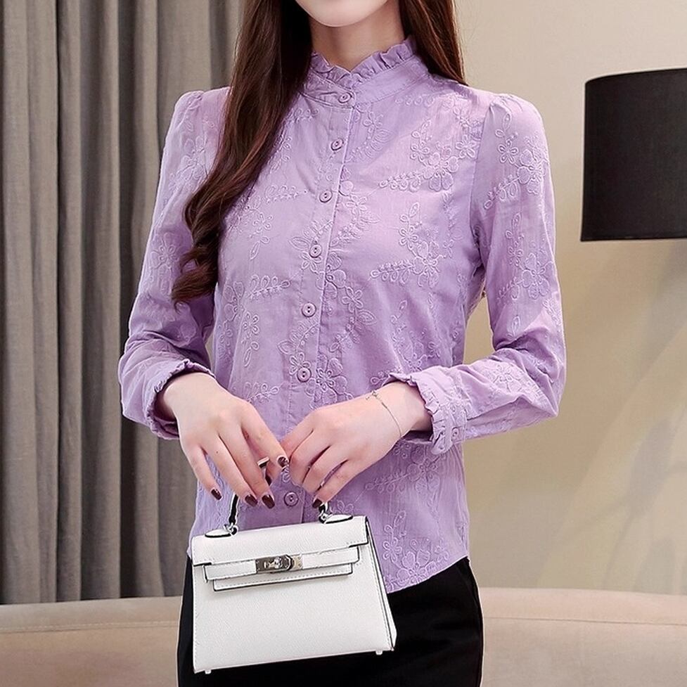 繊細なオリエンタル刺繍が目を惹くシャツブラウス。可愛いフリルネック&袖口が女性らしいアクセントです。細身のシルエットが映えるスリムデザイン。上品な立体感とエレガントな印象でオケージョンやオフィスカジュアルにもぴったり。シーズンを問わず使える万能さと刺繍の華やかさを兼ね備えたおすすめの一枚です。