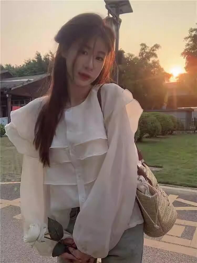 ふんわりとしたパフスリーブと重ねフリルデザインが女性らしい抜け感を演出する長袖ブラウス。ほどよいとろみ感とオーバーサイズのシルエットで、上品さとリラックス感を両立しました。
