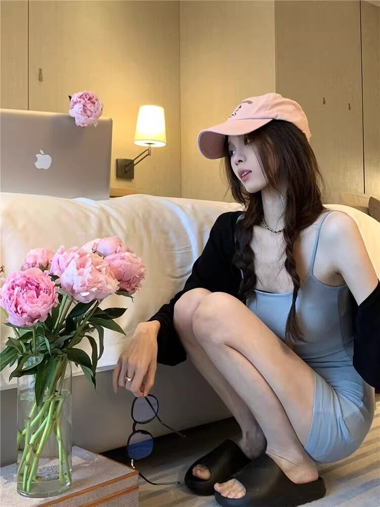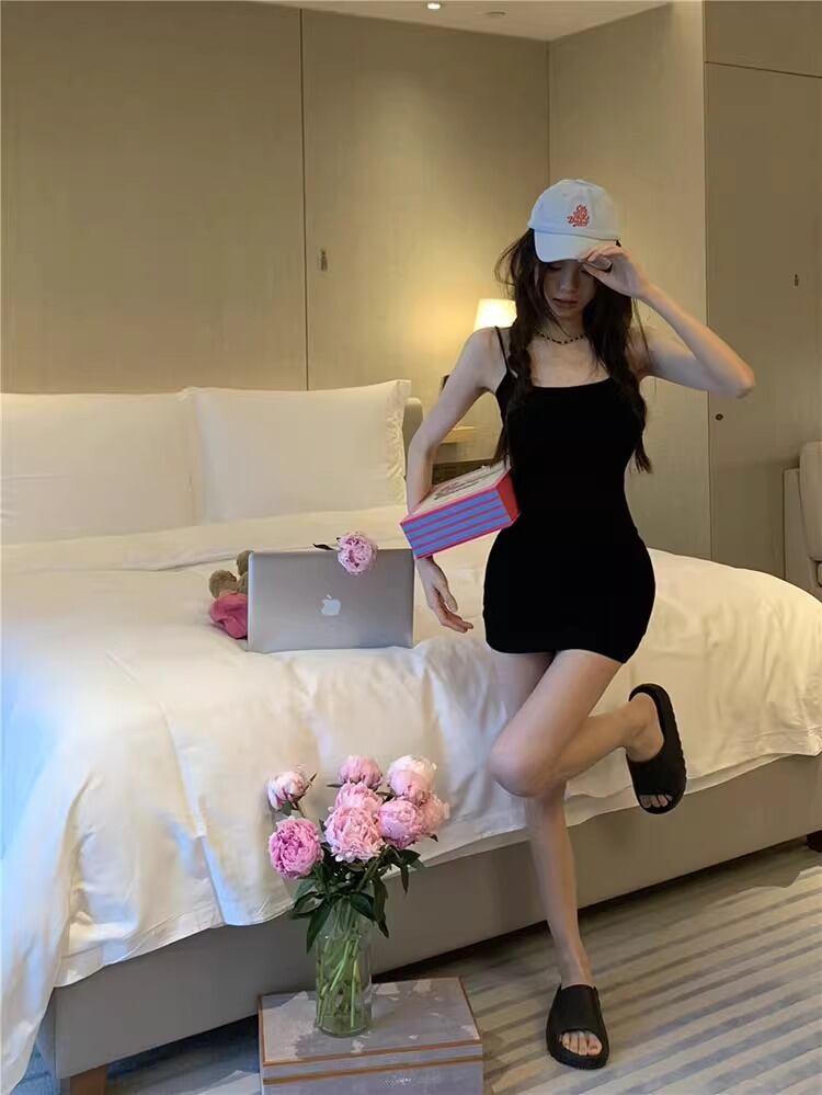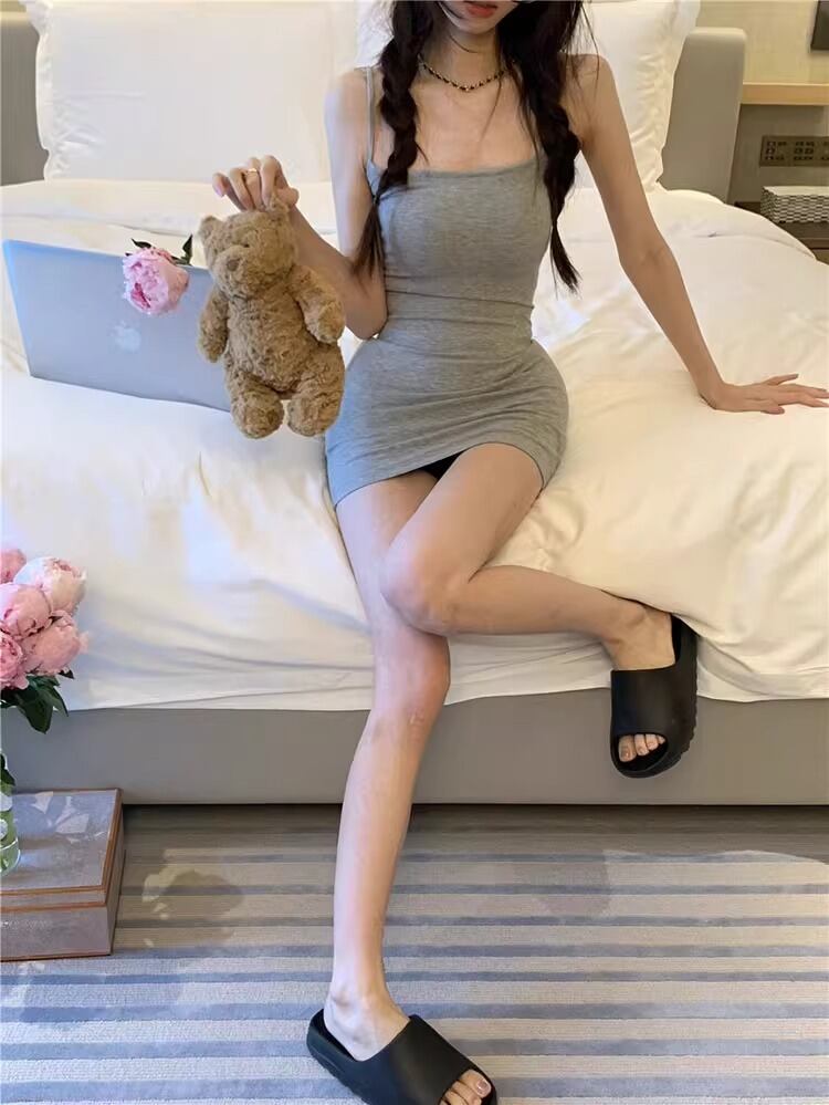 ミニとショートの絶妙なバランスが魅力で、ノースリーブとスクエアネックが軽やかな印象を演出します。