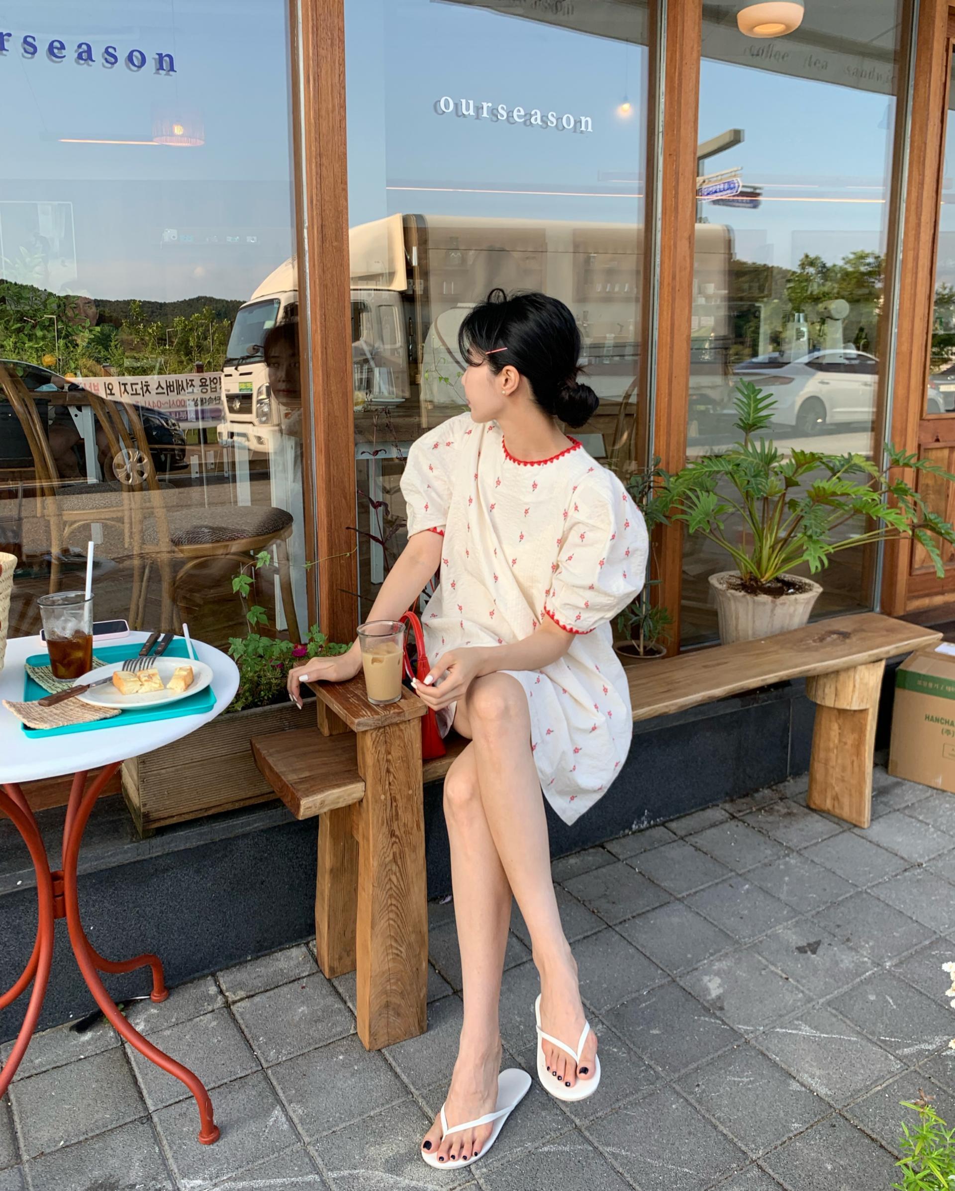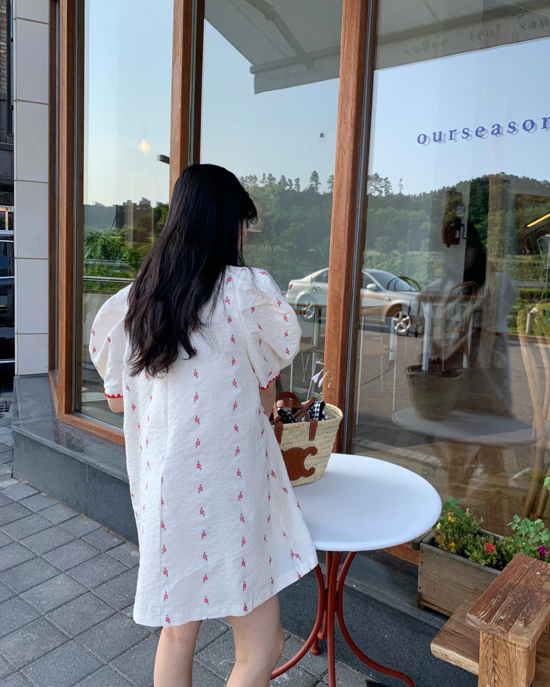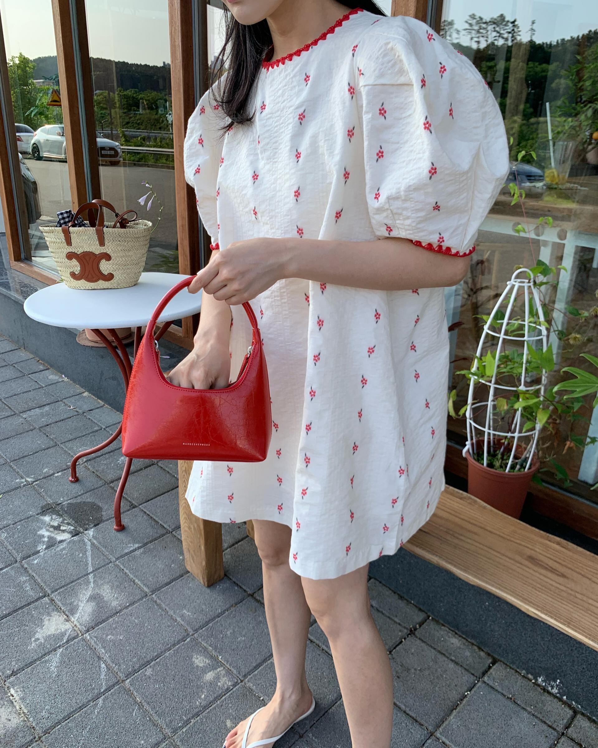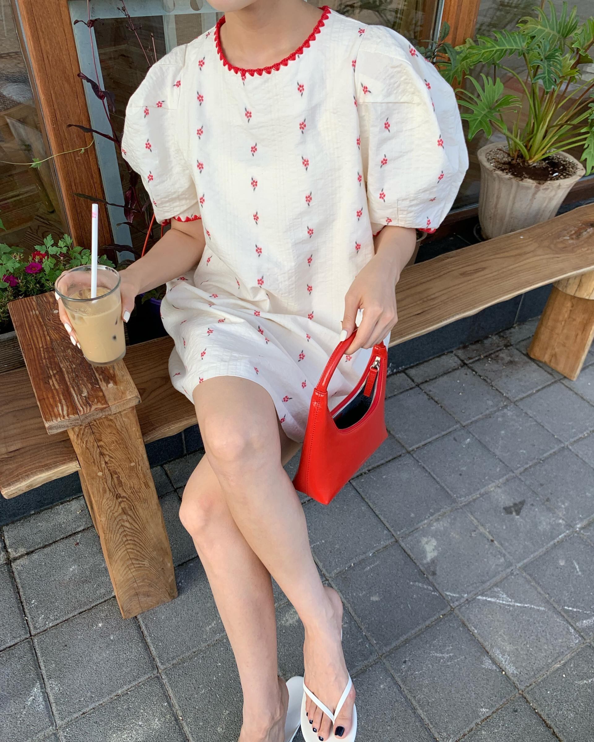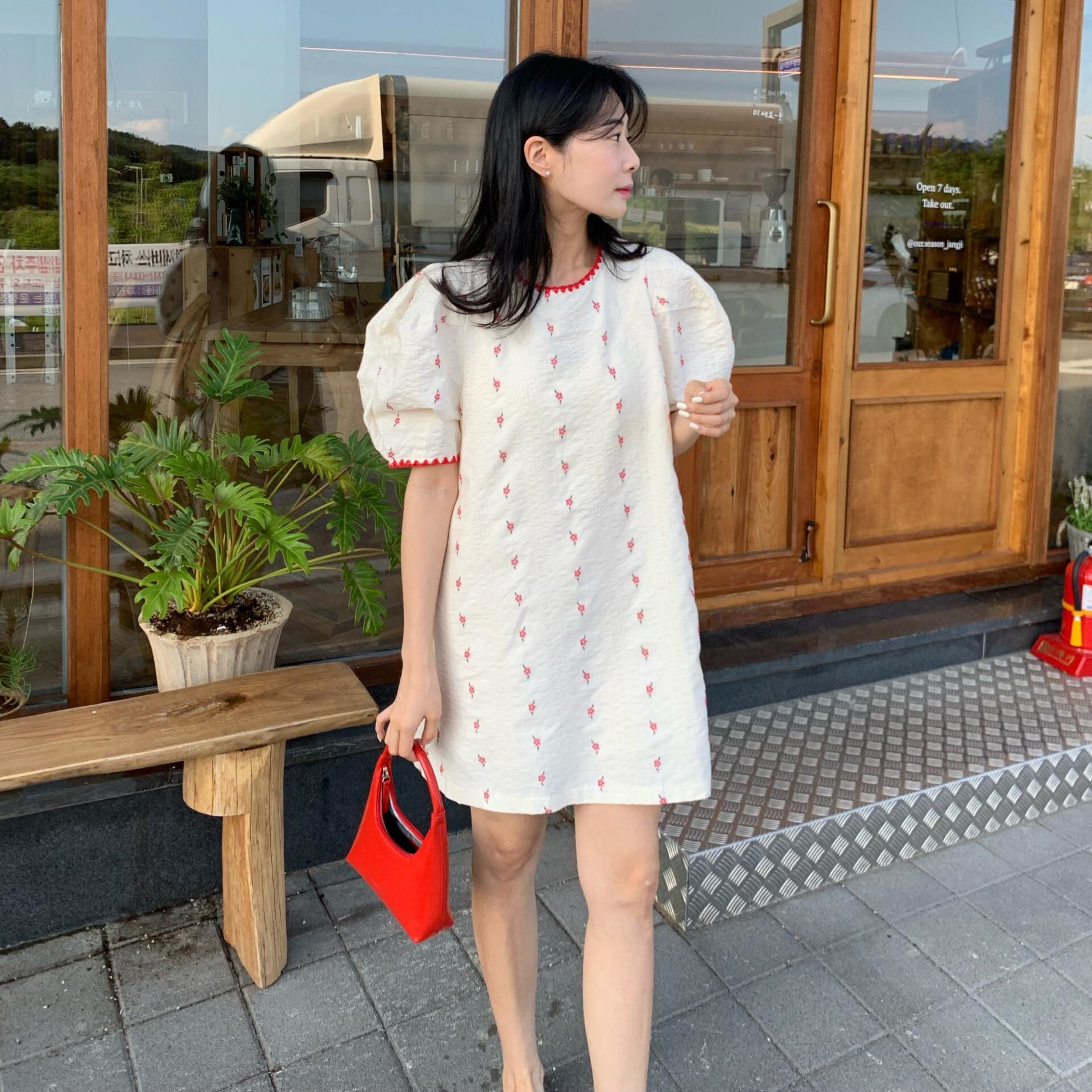 大人可愛い雰囲気を存分に楽しめるクルーネックパフスリーブワンピース。