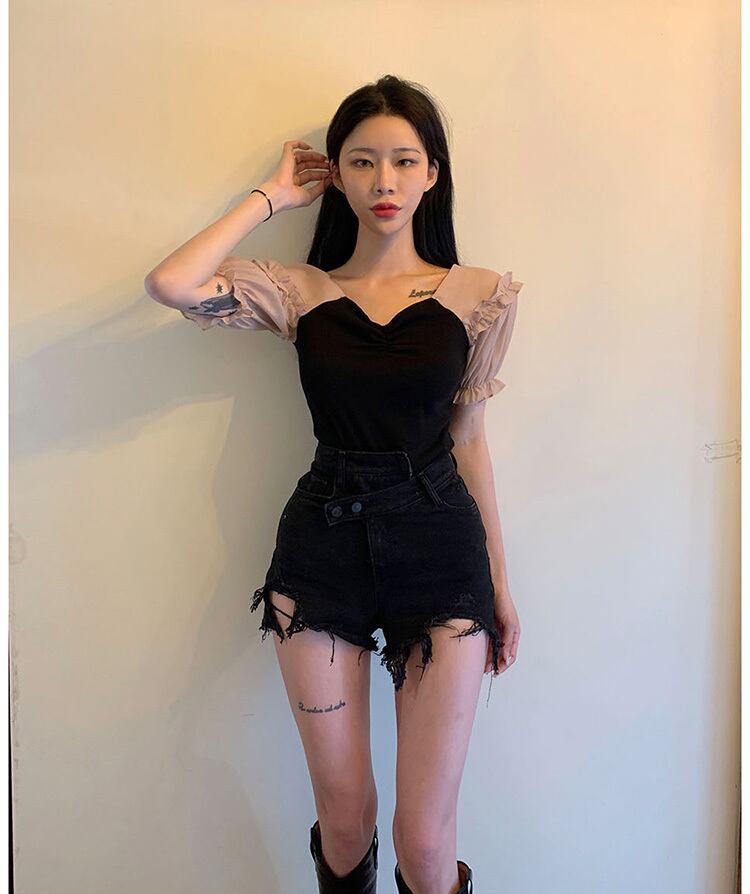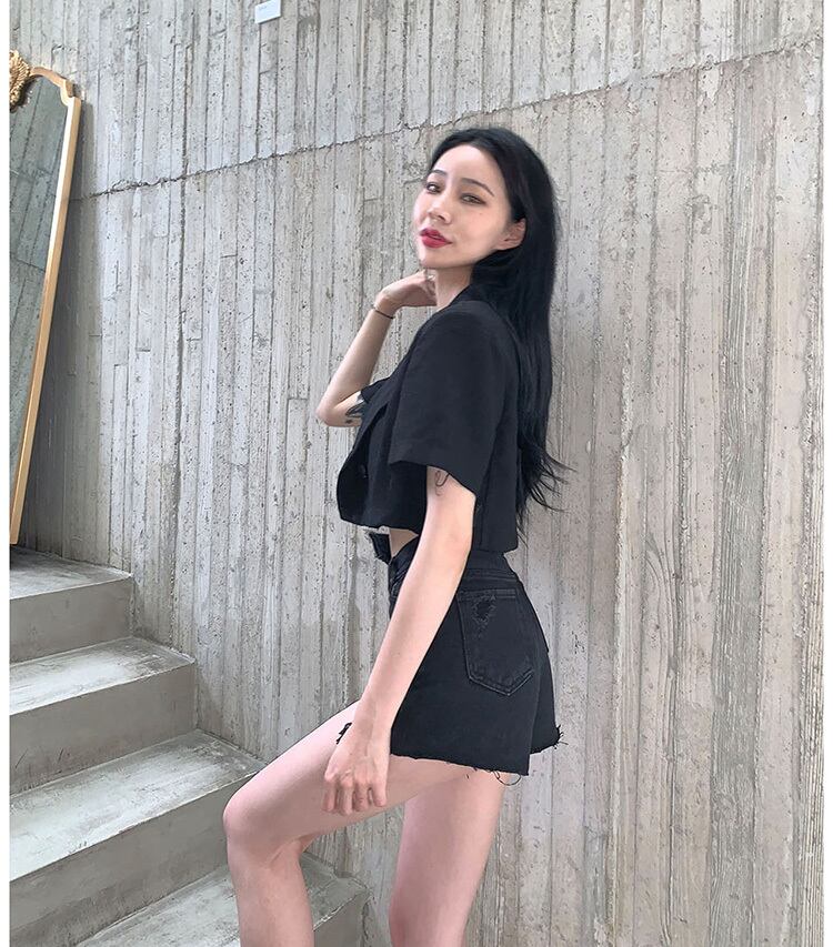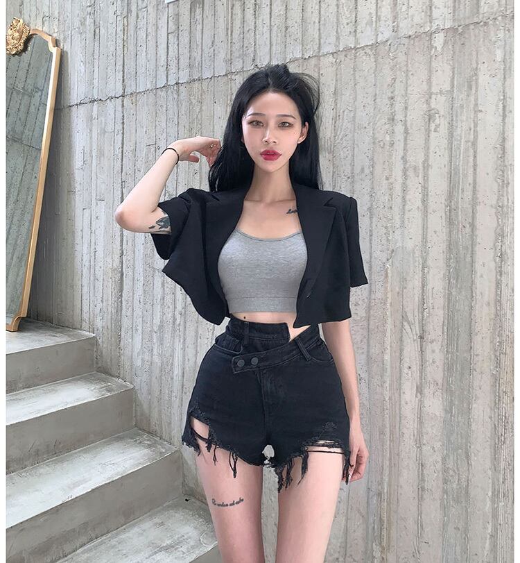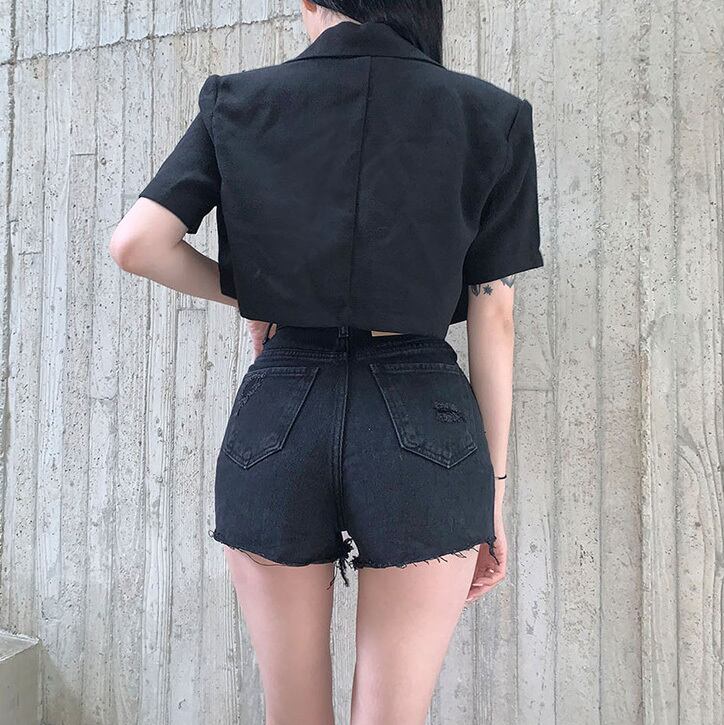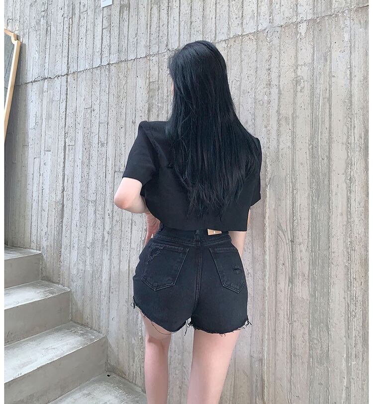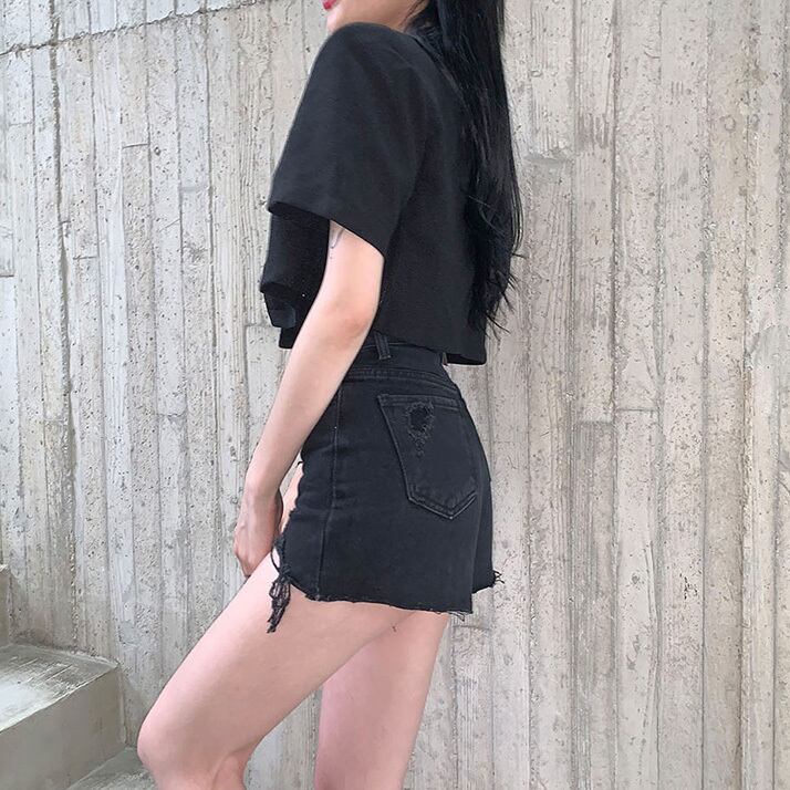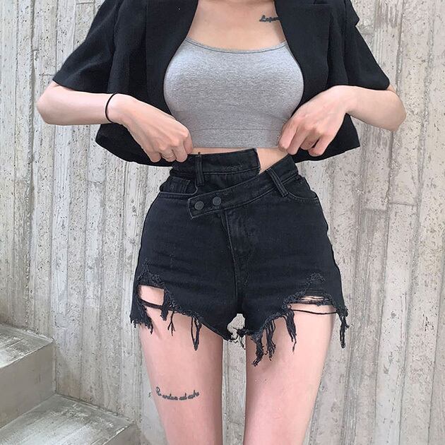 ダメージ加工が施されたブラックデニムショートパンツ。