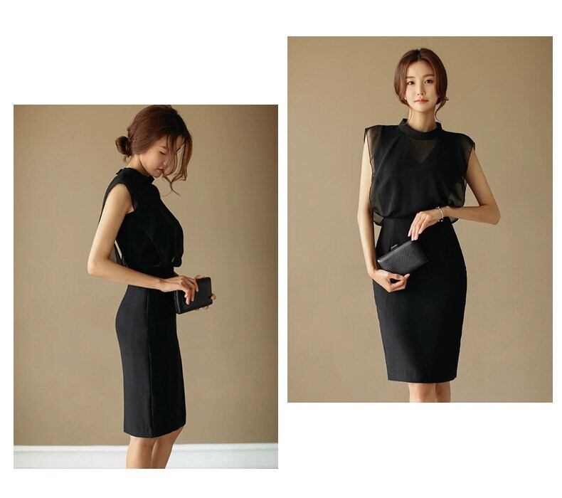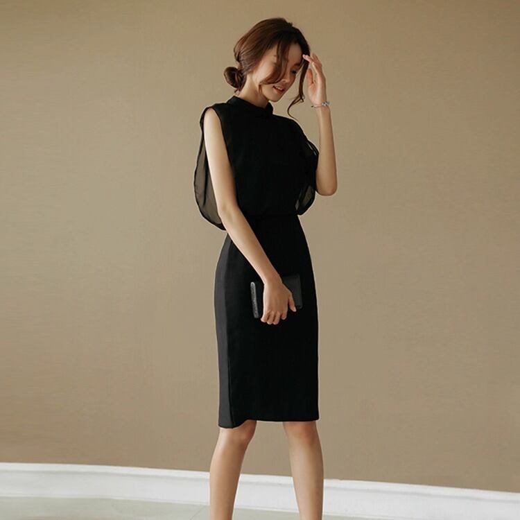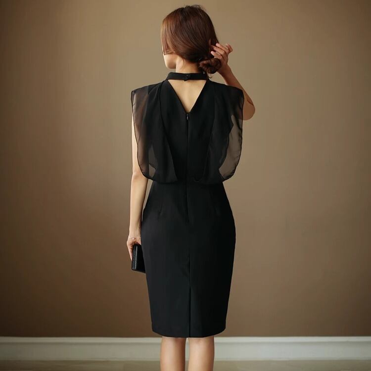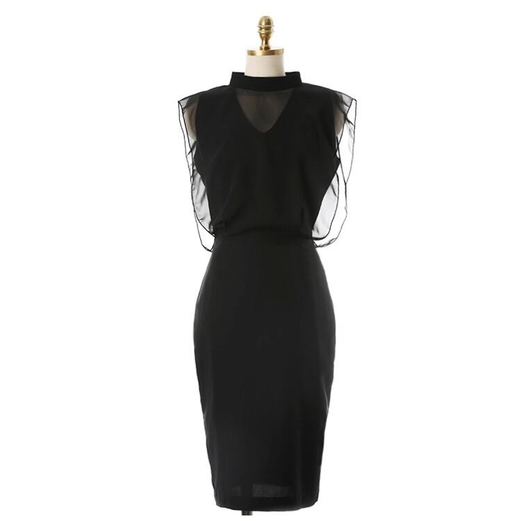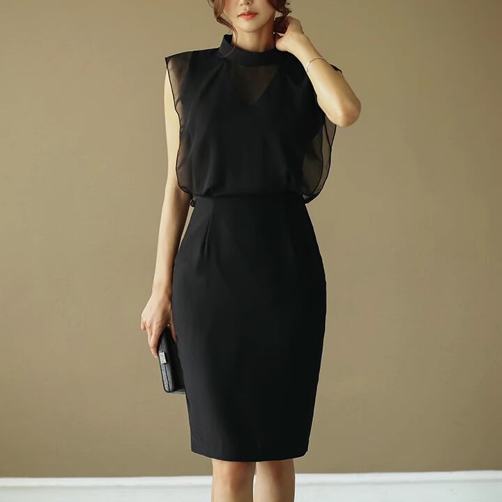 上品さとモード感を兼ね備えた、ブラックのノースリーブタイトワンピース。