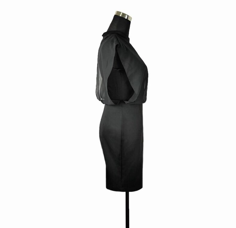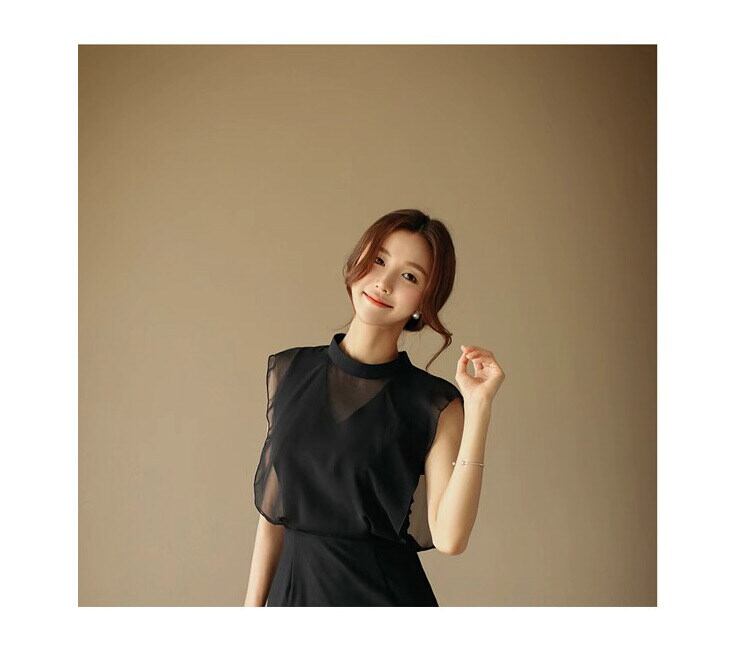 シースルーの透け感が女性らしい抜け感を演出し、ハイネックのデザインが凛とした印象を与えます。