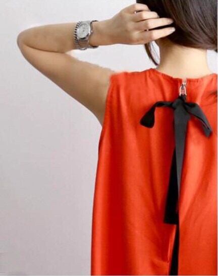 ラウンドネックとリボンのディテールがフェミニンな印象を添え、清楚で上品なスタイルに仕上がります。