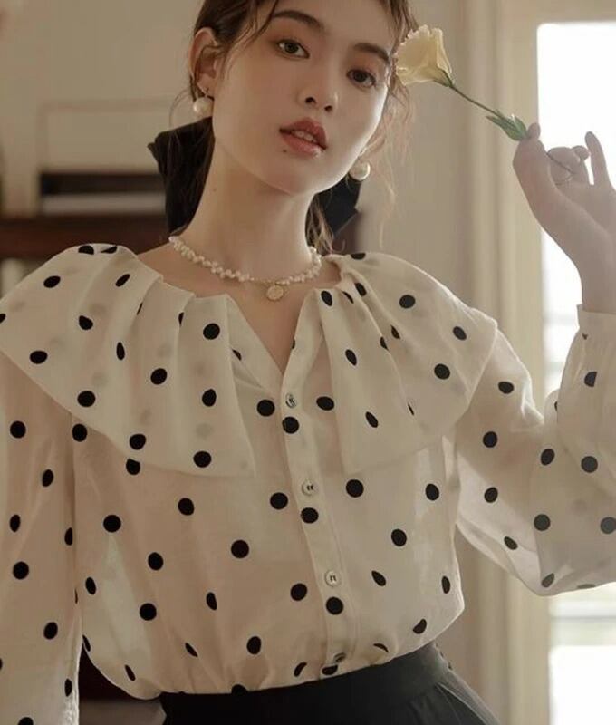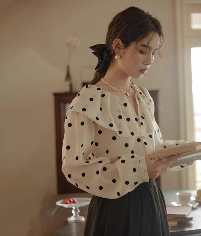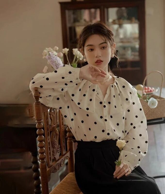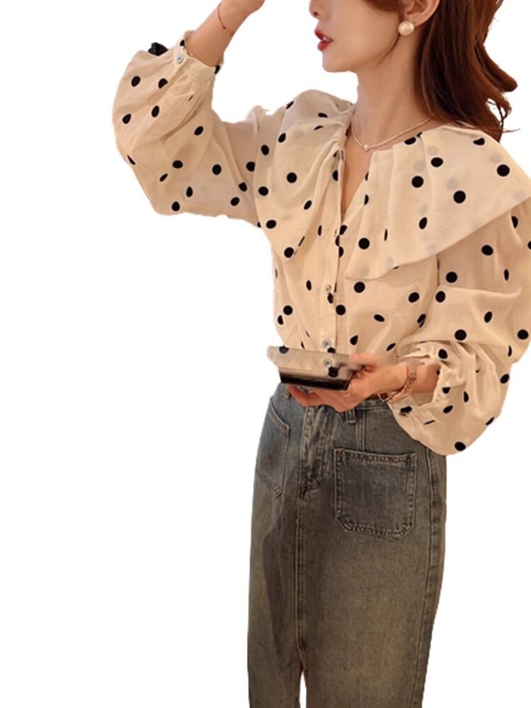 ボリューム袖と襟付きデザインが特徴のこのブラウスは、春夏秋冬問わず活躍します。