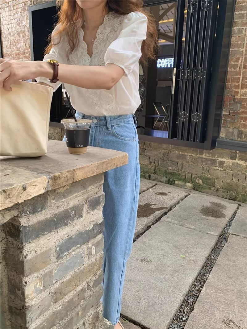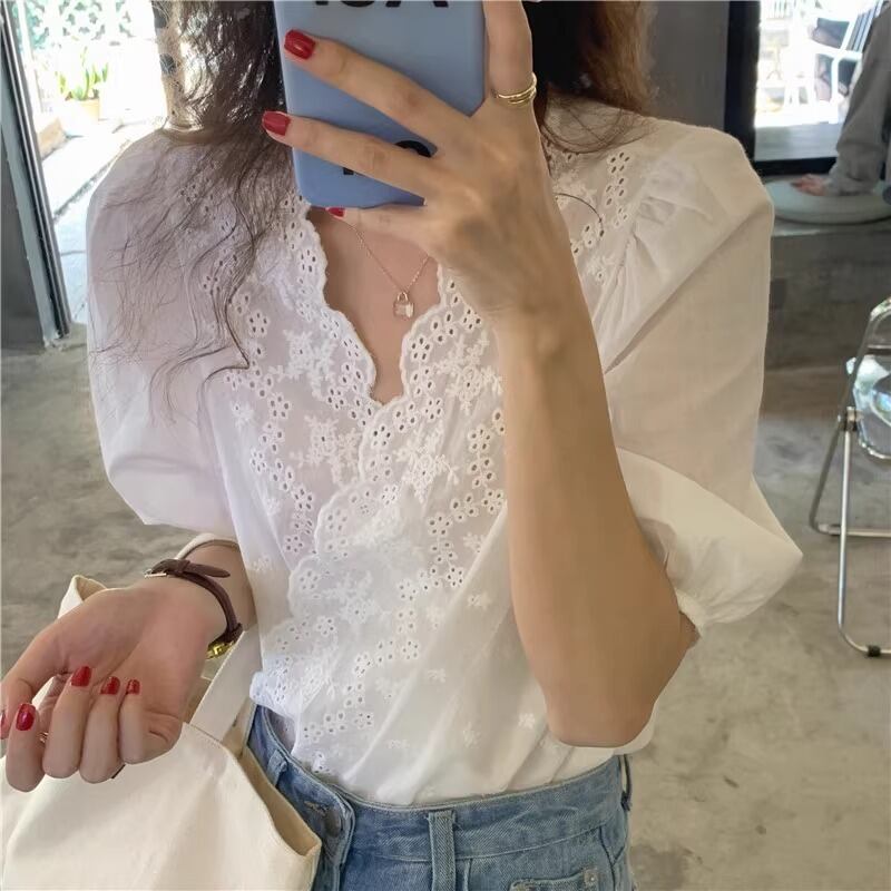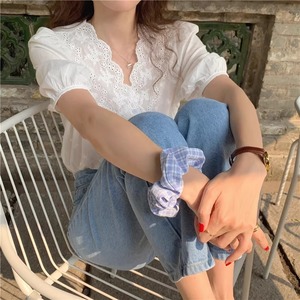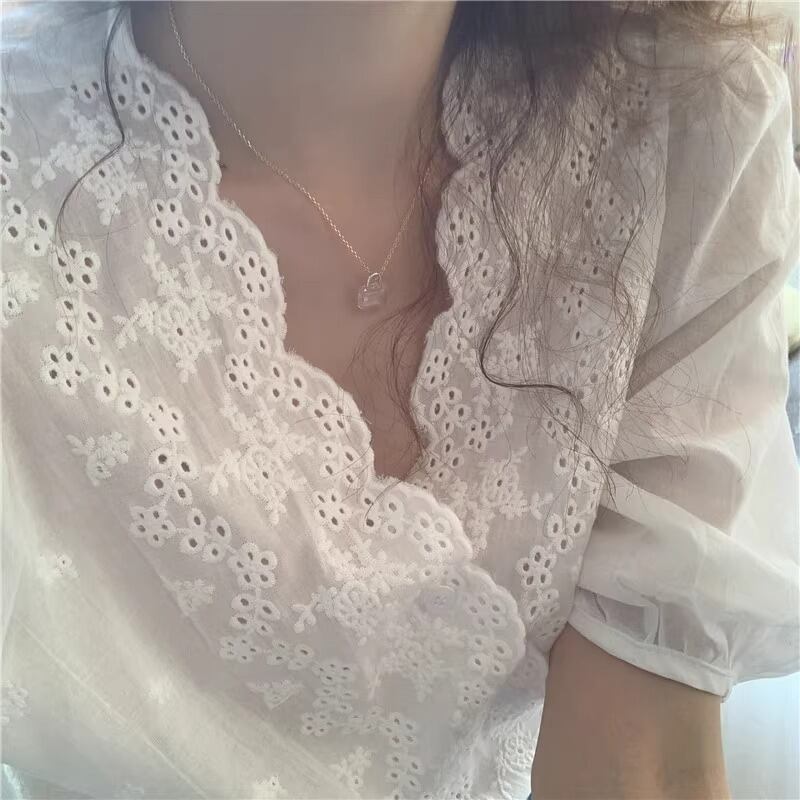 こちらのプルオーバーは、5分袖のパフスリーブやVネック、エレガントなレースボタンが特徴的で、春夏秋冬を通じて活躍するアイテムです。