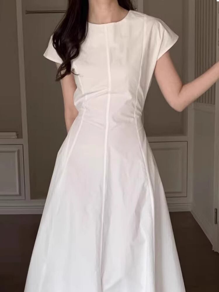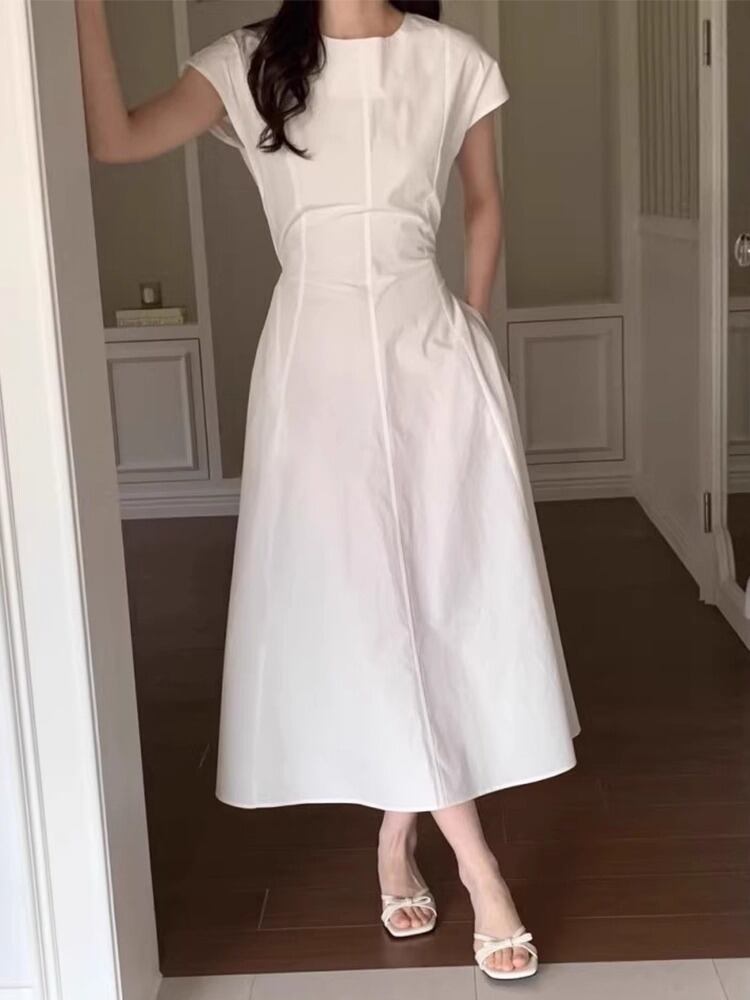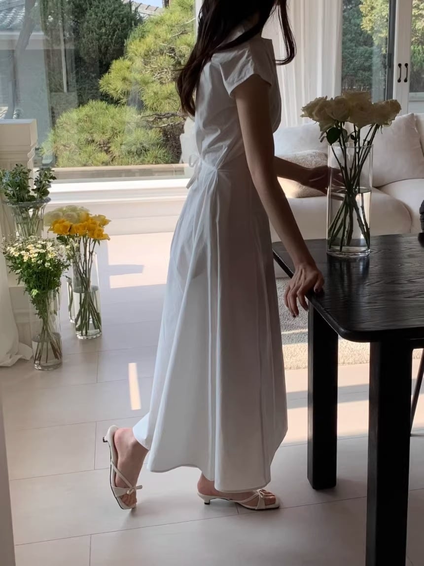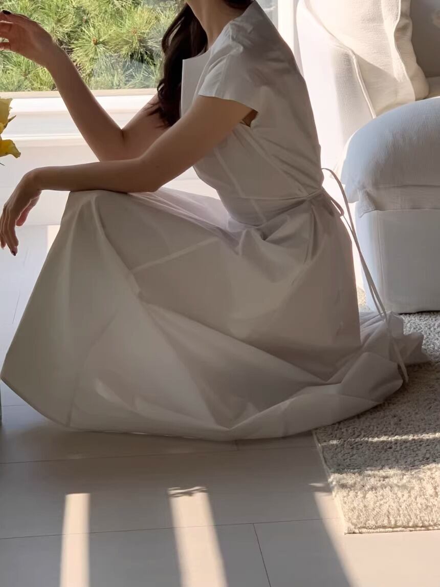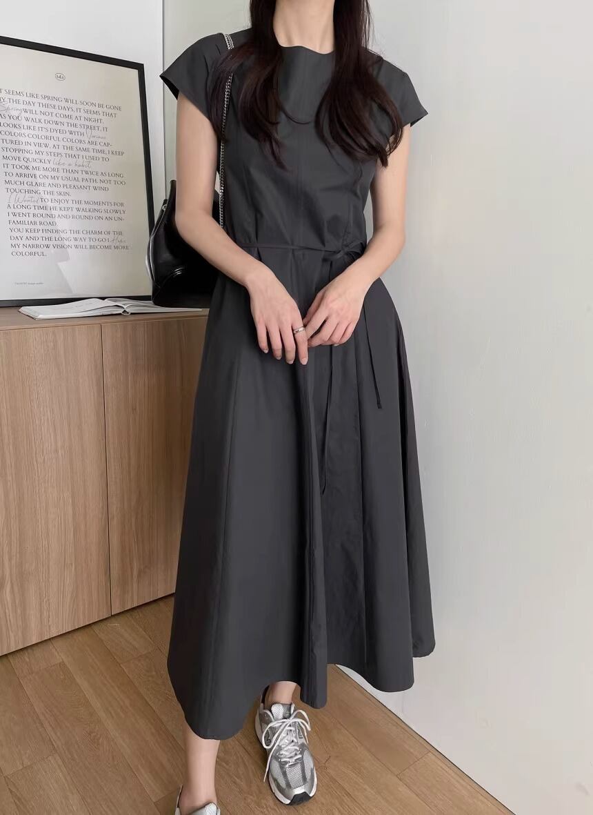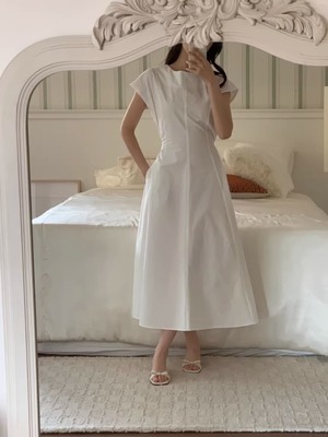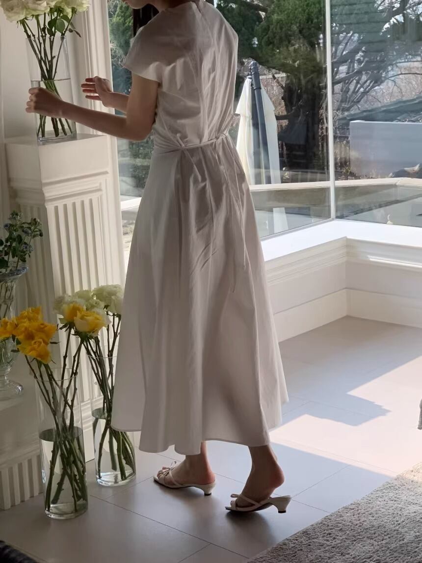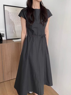 ラウンドネックのやさしいラインとウエストリボンのアクセントで、上品さとかわいらしさを両立します。