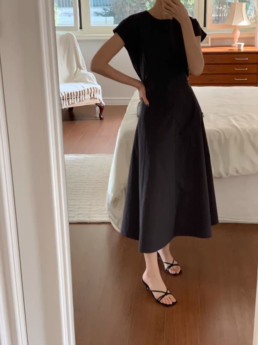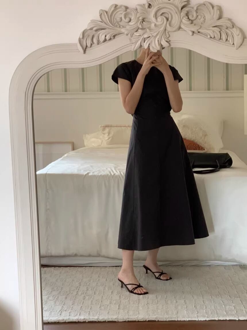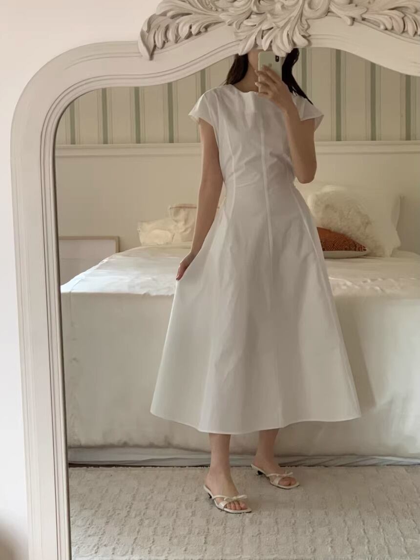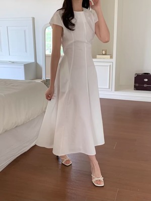 ふんわりと広がるAラインシルエットが女性らしさを引き立てる、フレンチスリーブのミモレ丈ワンピース。