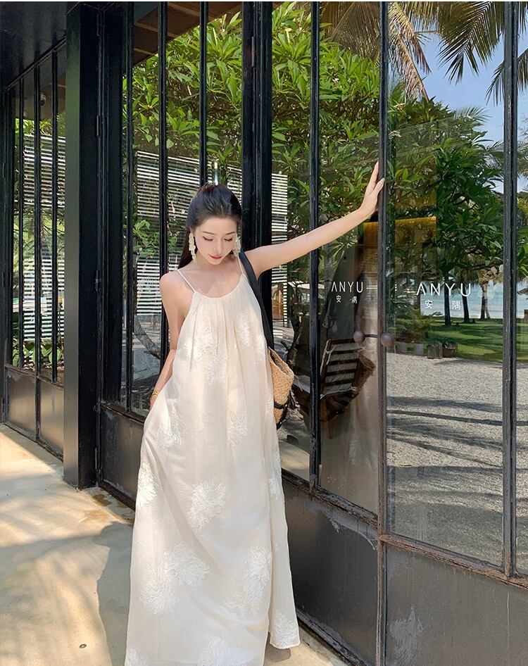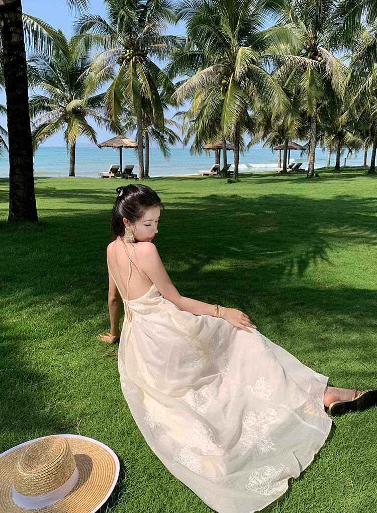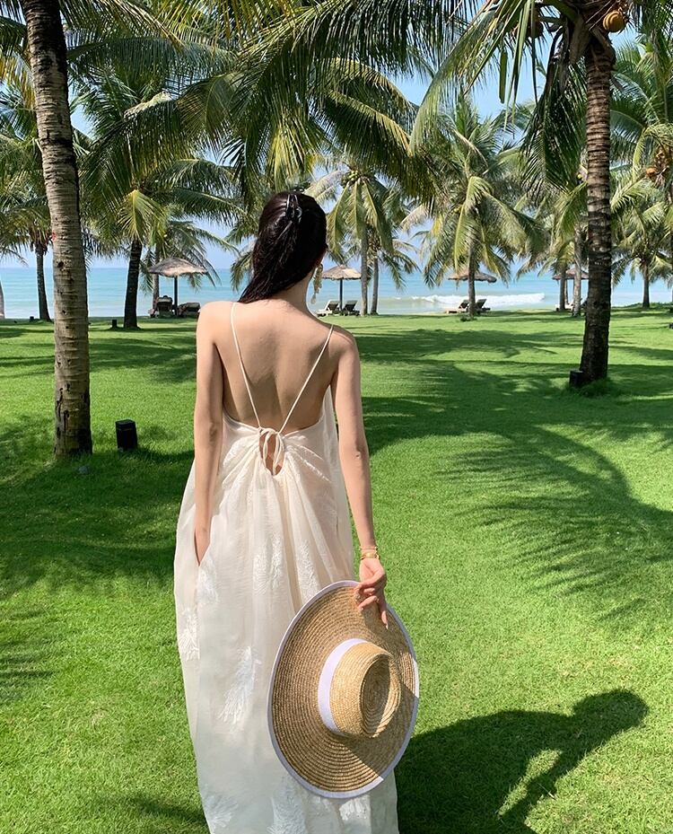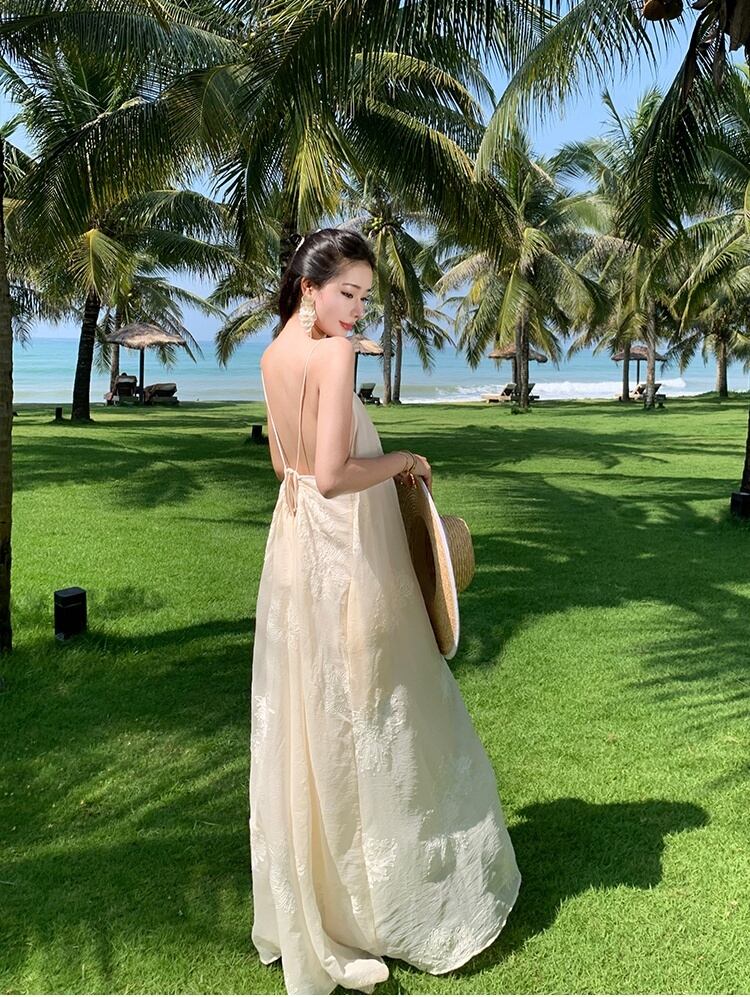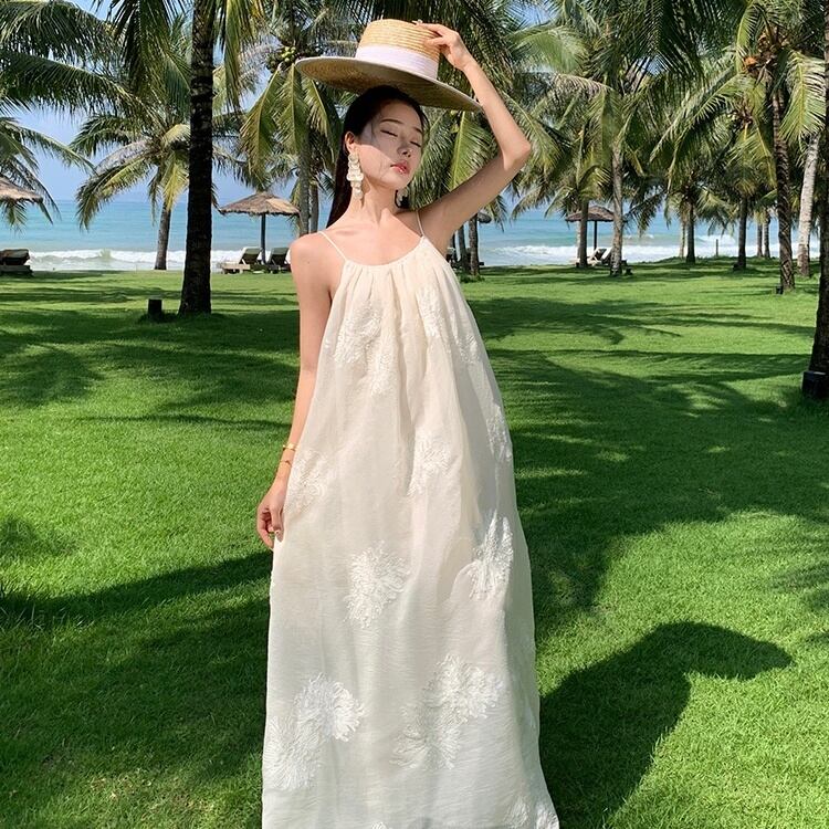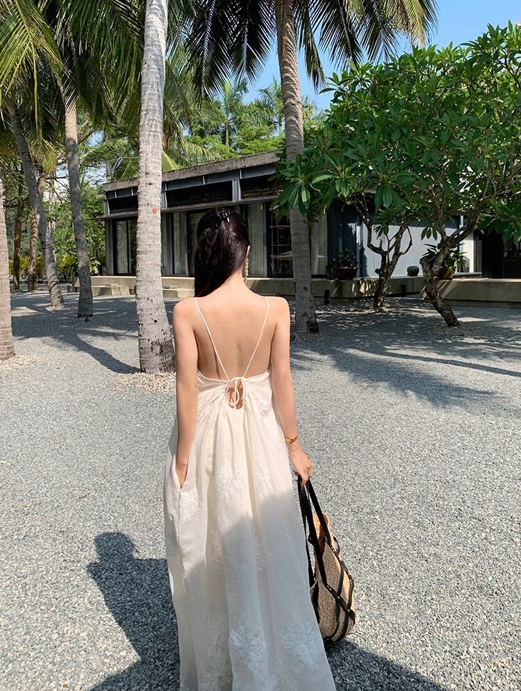 軽やかなマキシ丈とノースリーブデザインにより、春夏のリゾートシーンにぴったりな一枚。背中開きのデザインと透け感のある生地が、上品かつフェミニンな印象を引き立てます。立体感のある刺繍が施された部分が、より一層のラグジュアリー感を演出。リゾートはもちろん、ビーチやプールなど様々なシーンで活躍すること間違いなしです。