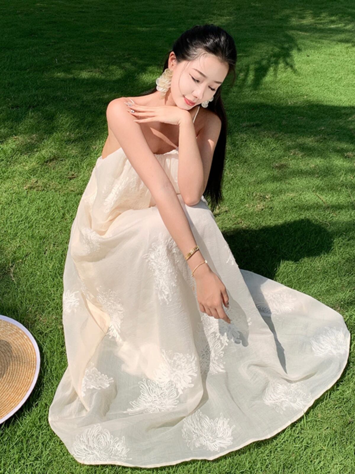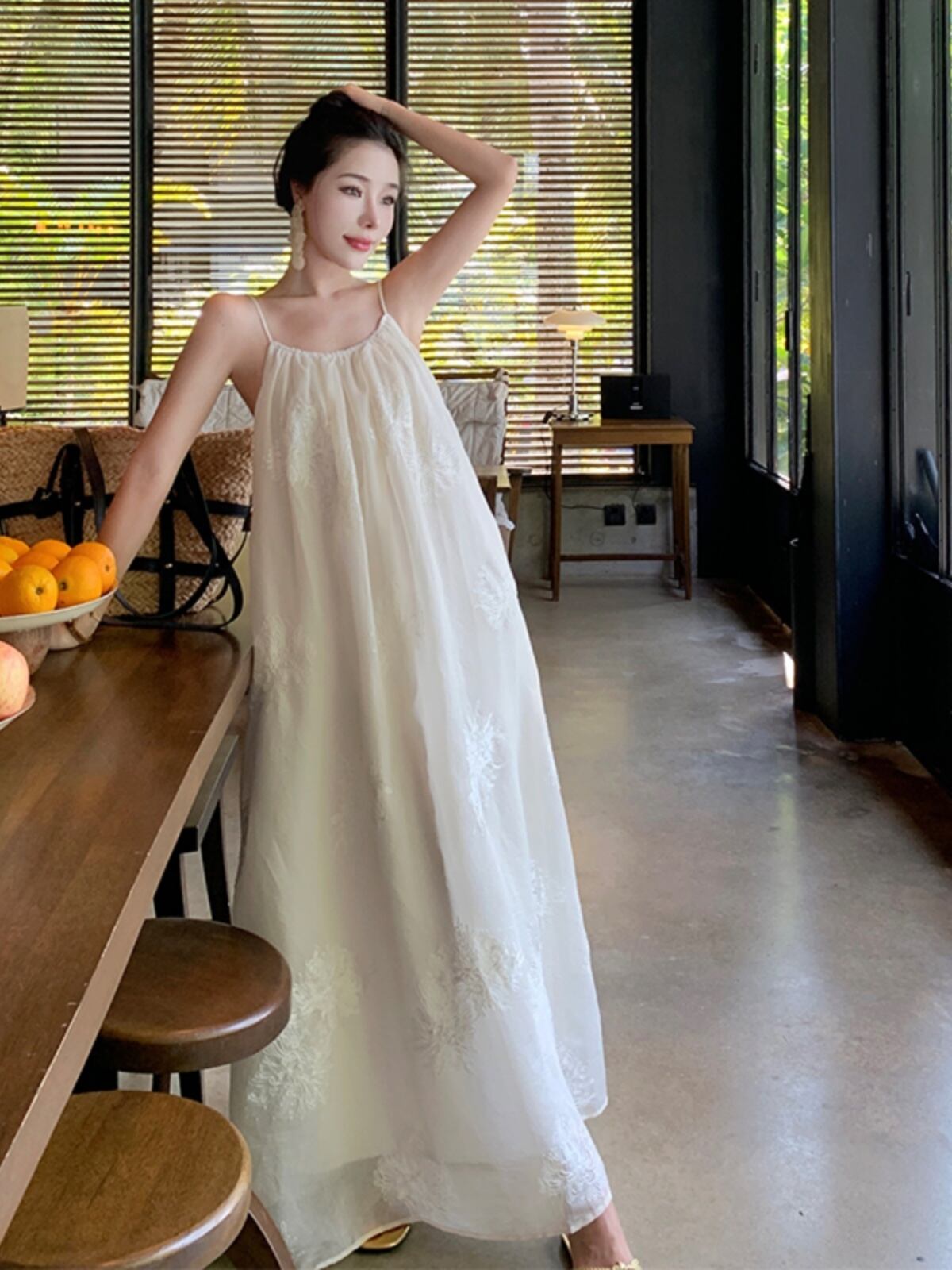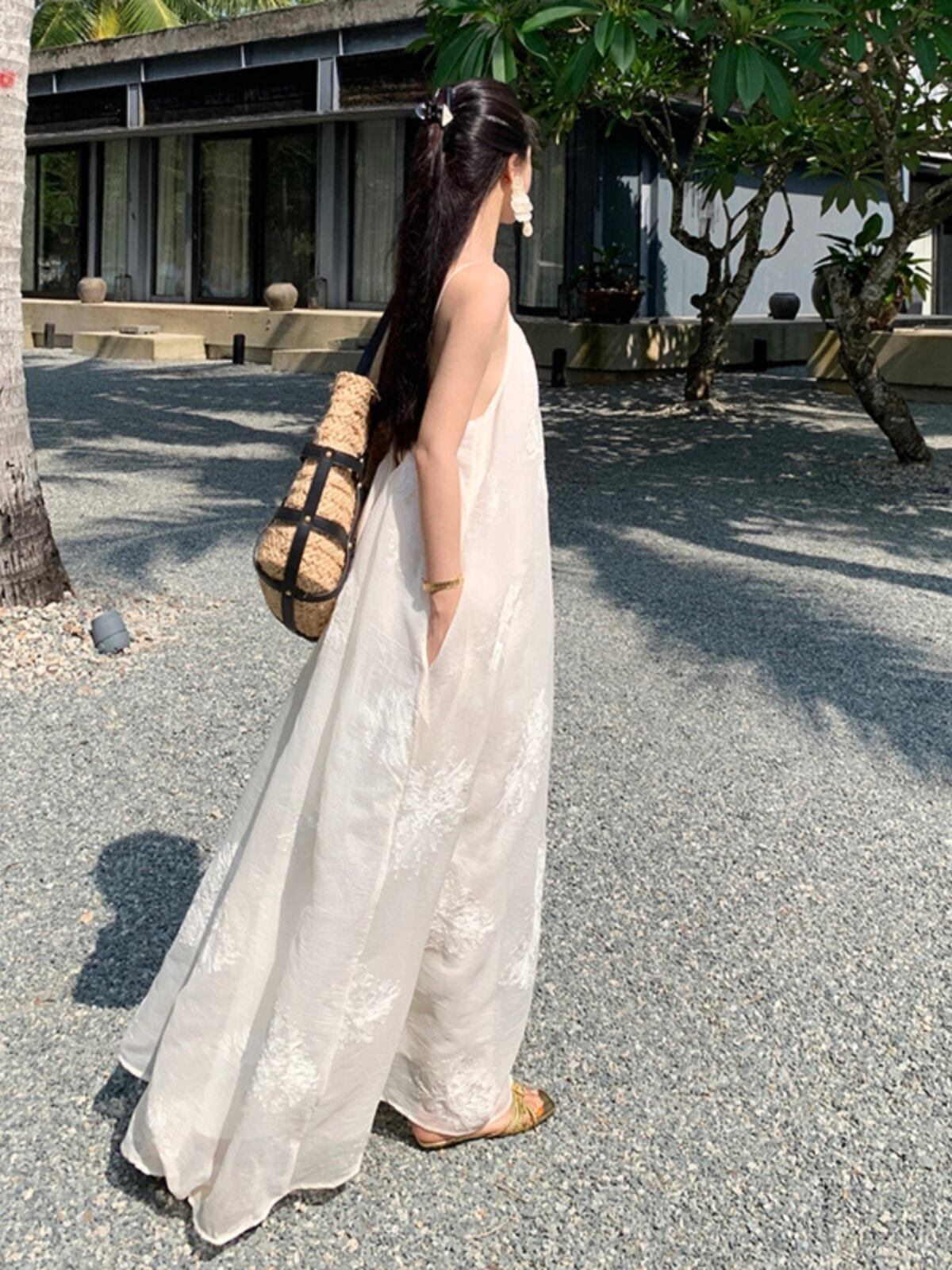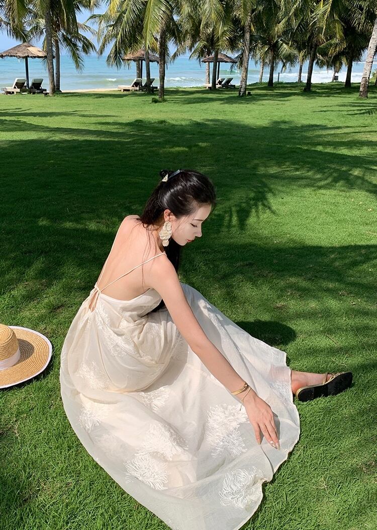 軽やかなマキシ丈とノースリーブデザインにより、春夏のリゾートシーンにぴったりな一枚。背中開きのデザインと透け感のある生地が、上品かつフェミニンな印象を引き立てます。立体感のある刺繍が施された部分が、より一層のラグジュアリー感を演出。リゾートはもちろん、ビーチやプールなど様々なシーンで活躍すること間違いなしです。