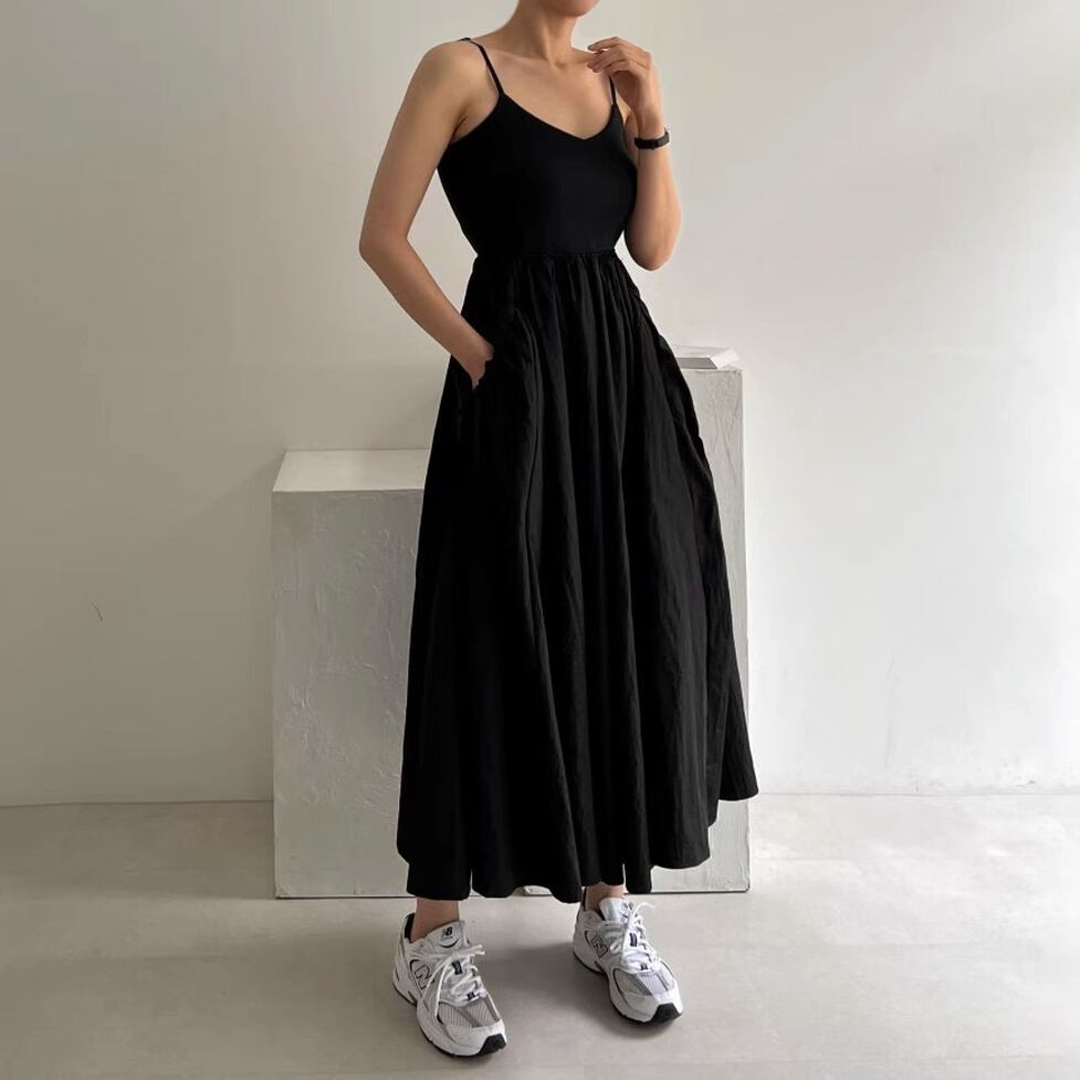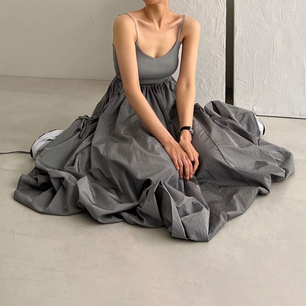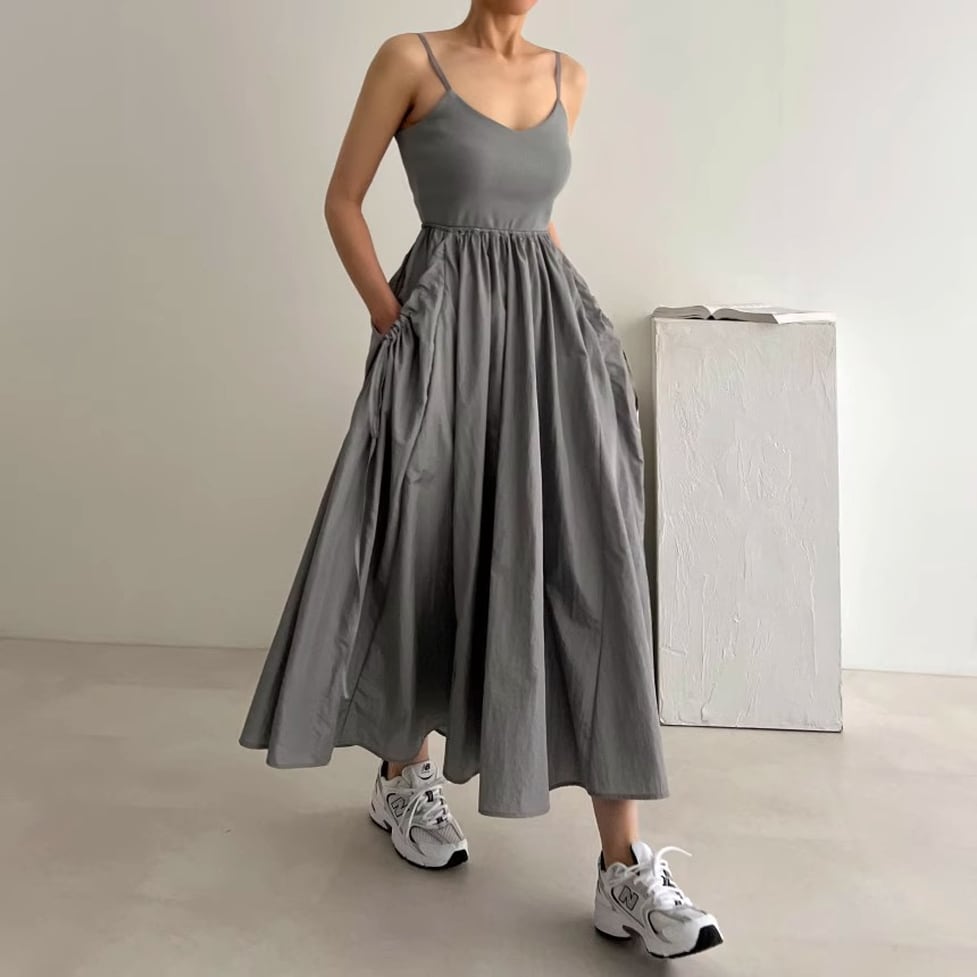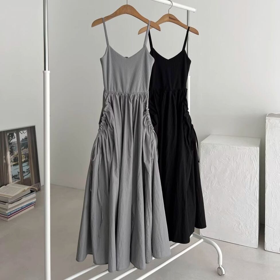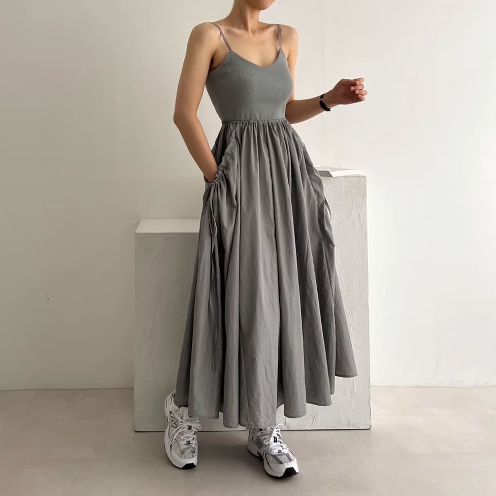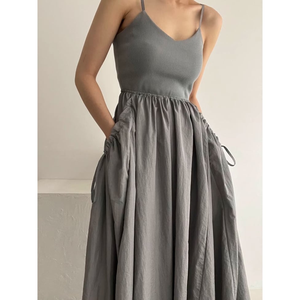 ユニークなポケットのデザインが特徴のギャザーフレアキャミワンピース。力んで見えないキレイな服。ラクなのにキレイな疲れないオシャレ。理想的なスタイリングをかなえる。リラックス感をともなったスタイル&バランスUPを両得。気楽なクラシックスタイルが完成。オシャレに新鮮なアイテムを効果的にとり入れたい。