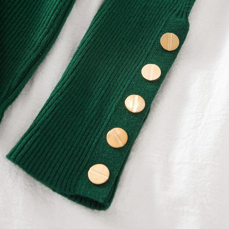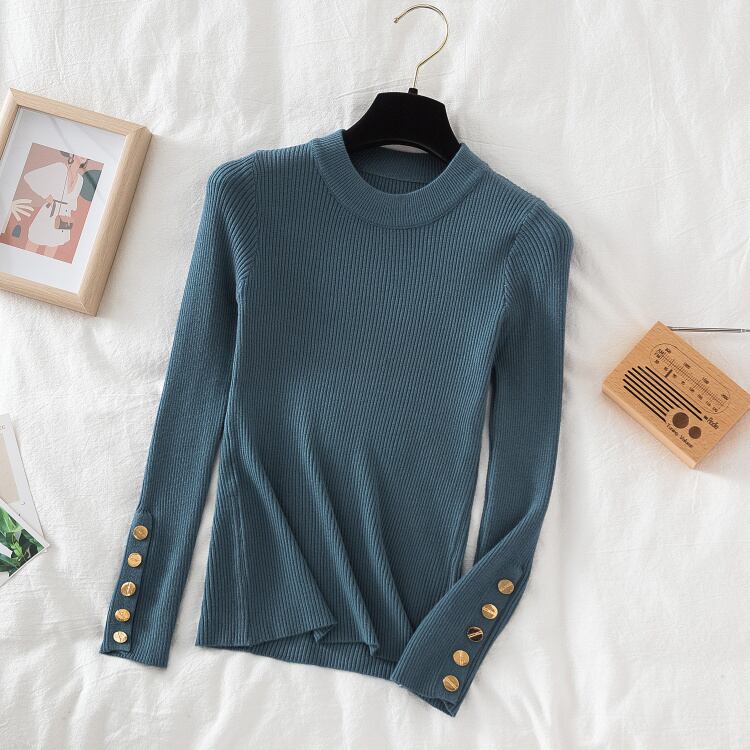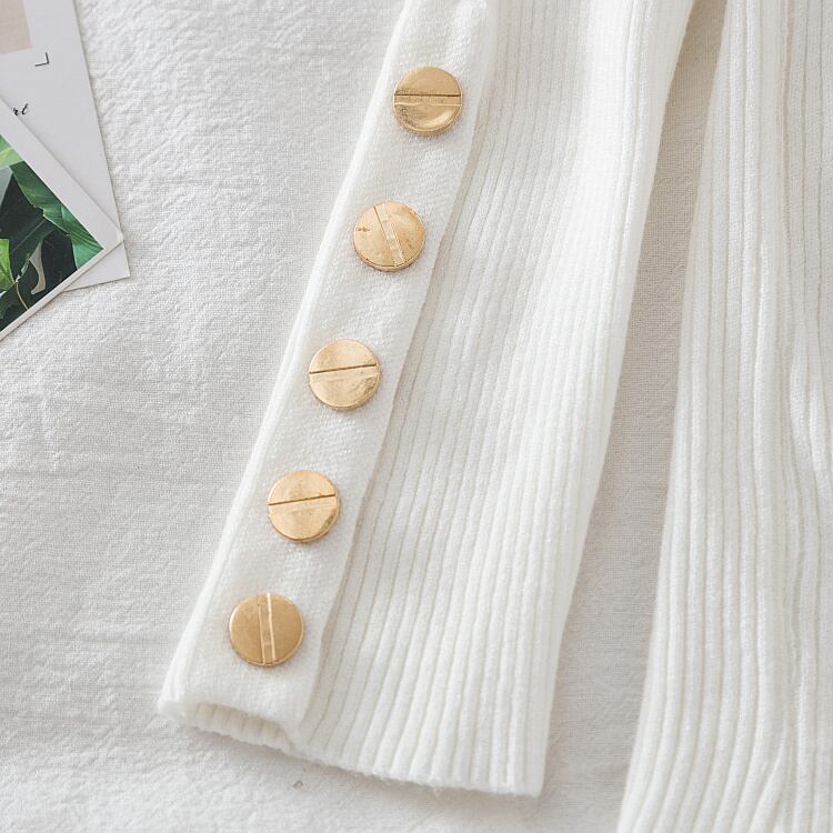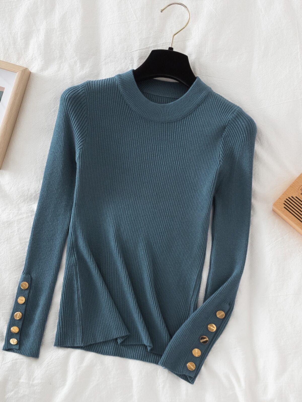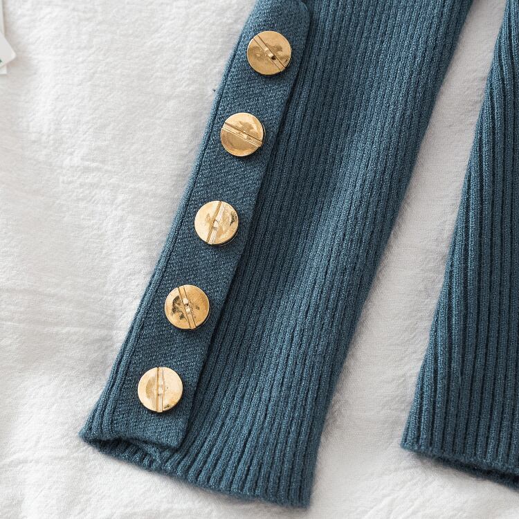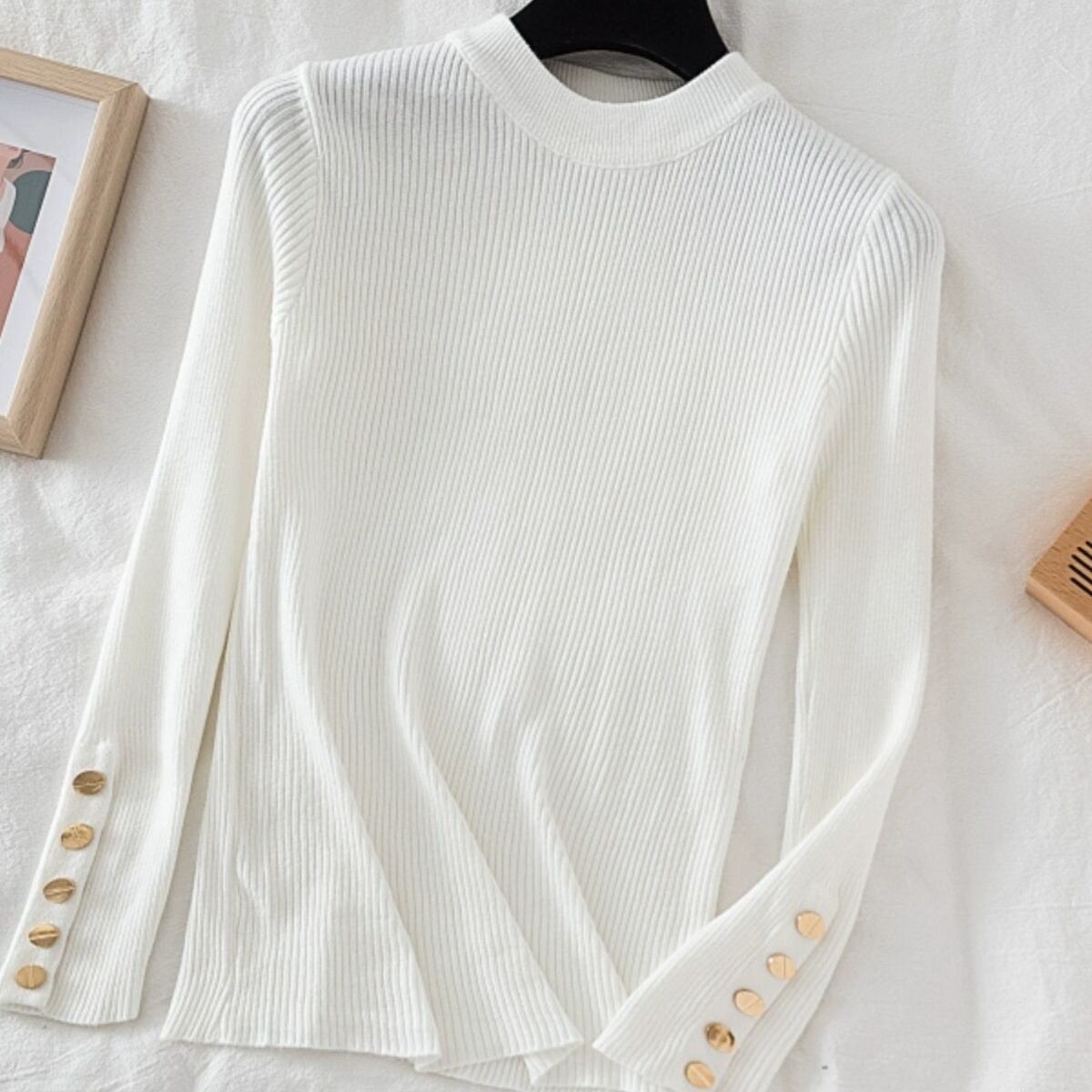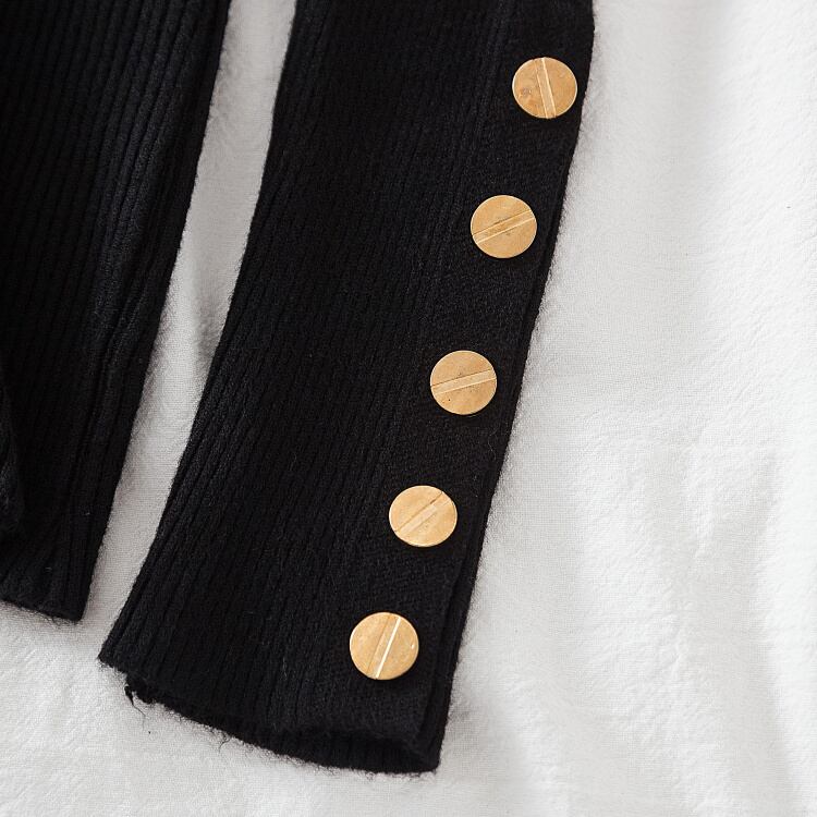 このニットセーターは、クルーネックのシンプルなデザインに袖口に施されたボタンが、ポイント!リブニットの伸縮性があり、フィット感を楽しめます。細身でスリムなシルエットが、大人可愛い印象を演出。これ一枚で女性らしさを引き立てること間違いなしです。