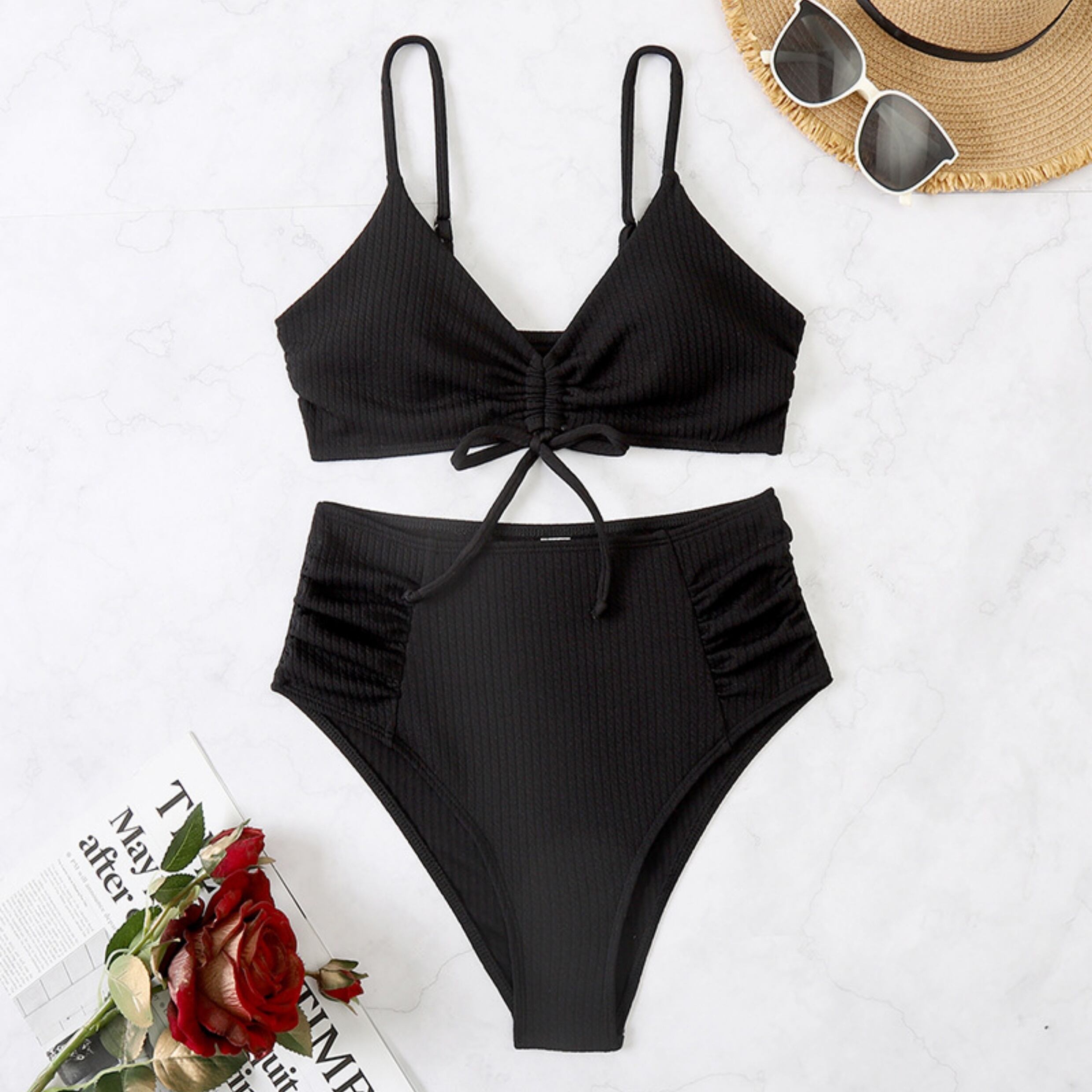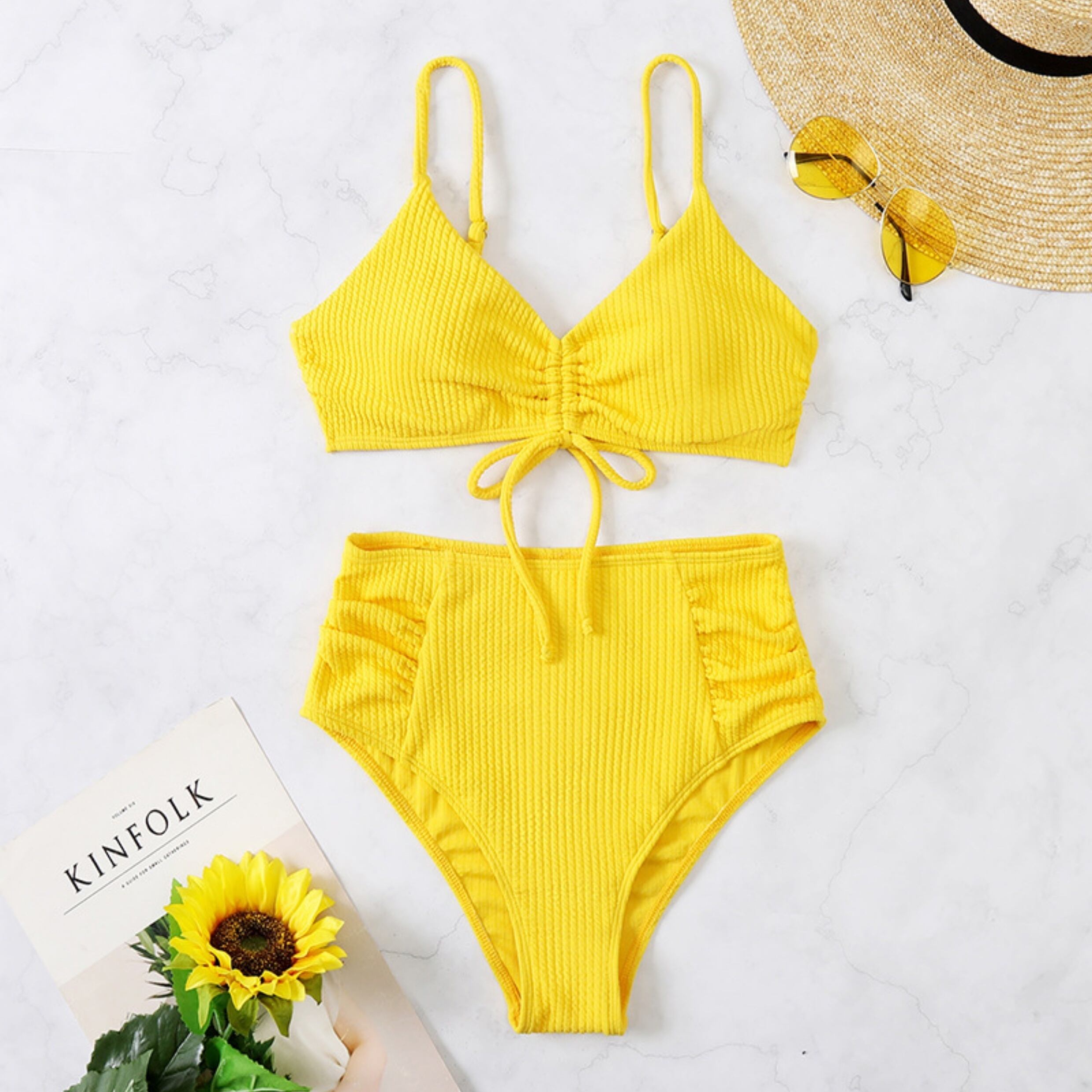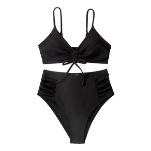 シンプルでありながらセクシーさを引き立てるオフショルとノンワイヤーのデザインが特徴。キャミスタイルのトップスは、女性らしい雰囲気を演出し、ハイウエストのボトムスは美脚効果抜群です。リボンがアクセントとなり、かわいらしさもプラス!胸元にはギャザーを施し、窮屈感なくリラクシーな着心地を実現してくれます。スタイリッシュでありつつ、リゾートやプールサイドで映えるお洒落な一着です。